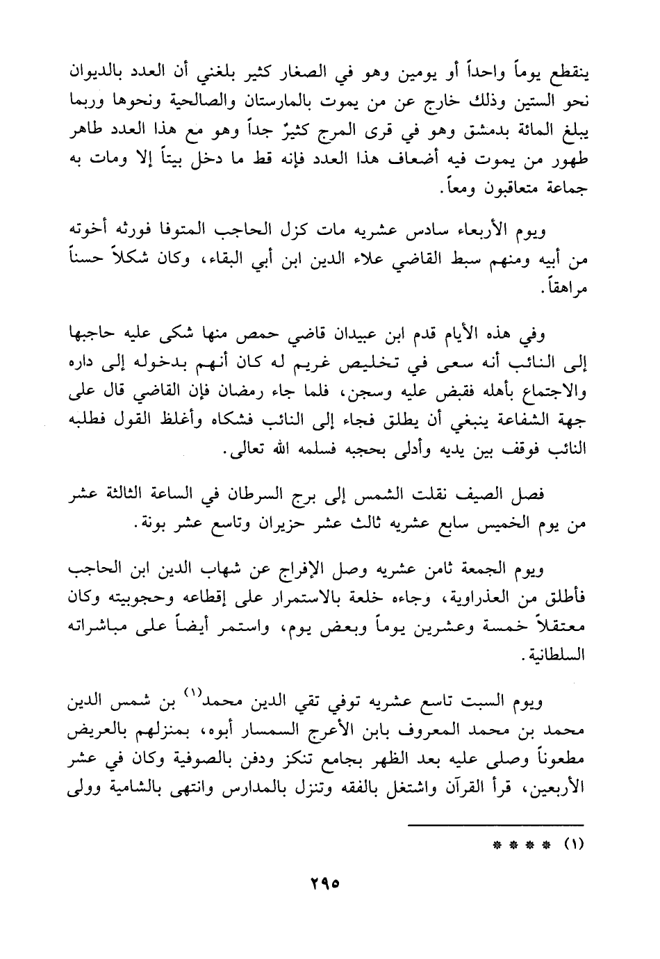 ينقطع يومًا واحدًا أو يومين وهو في الصغار كثير بلغني أن العدد بالديوان نحو الستين وذلك خارج عن من يموت بالمارستان والصالحية ونحوها وربما يبلغ المائة بدمشق وهو في قرى المرج كثيرٌ جدًا وهو مع هذا العدد طاهر طهور من يموت فيه أضعاف هذا العدد فإنه قط ما دخل بيتاً إلا ومات به جماعة متعاقبون ومعًا.