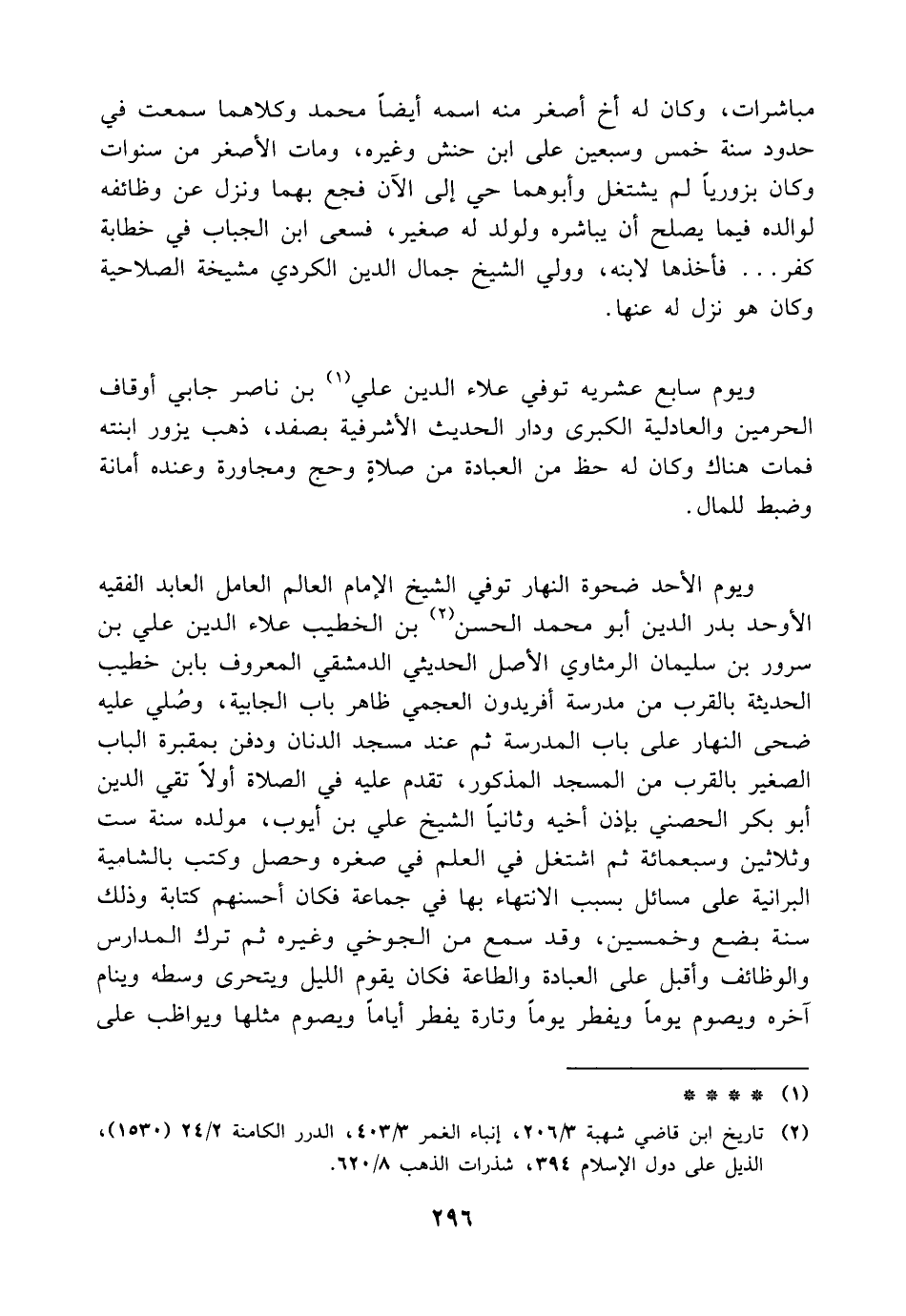 مباشرات، وكان له أخ أصغر منه اسمه أيضًا محمد وكلاهما سمعت في حدود سنة خمس وسبعين على ابن حنش وغيره، ومات الأصغر من سنوات وكان بزوريًا لم يشتغل وأَبوهما حي إلى الآن فجع بهما ونزل عن وظائفه لوالده فيما يصلح أن يباشره ولولد له صغير، فسعى ابن الجباب في خطابة كفر ... فأخذها لابنه، وولي الشيخ جمال الدين الكردي مشيخة الصلاحية وكان هو نزل له عنها.