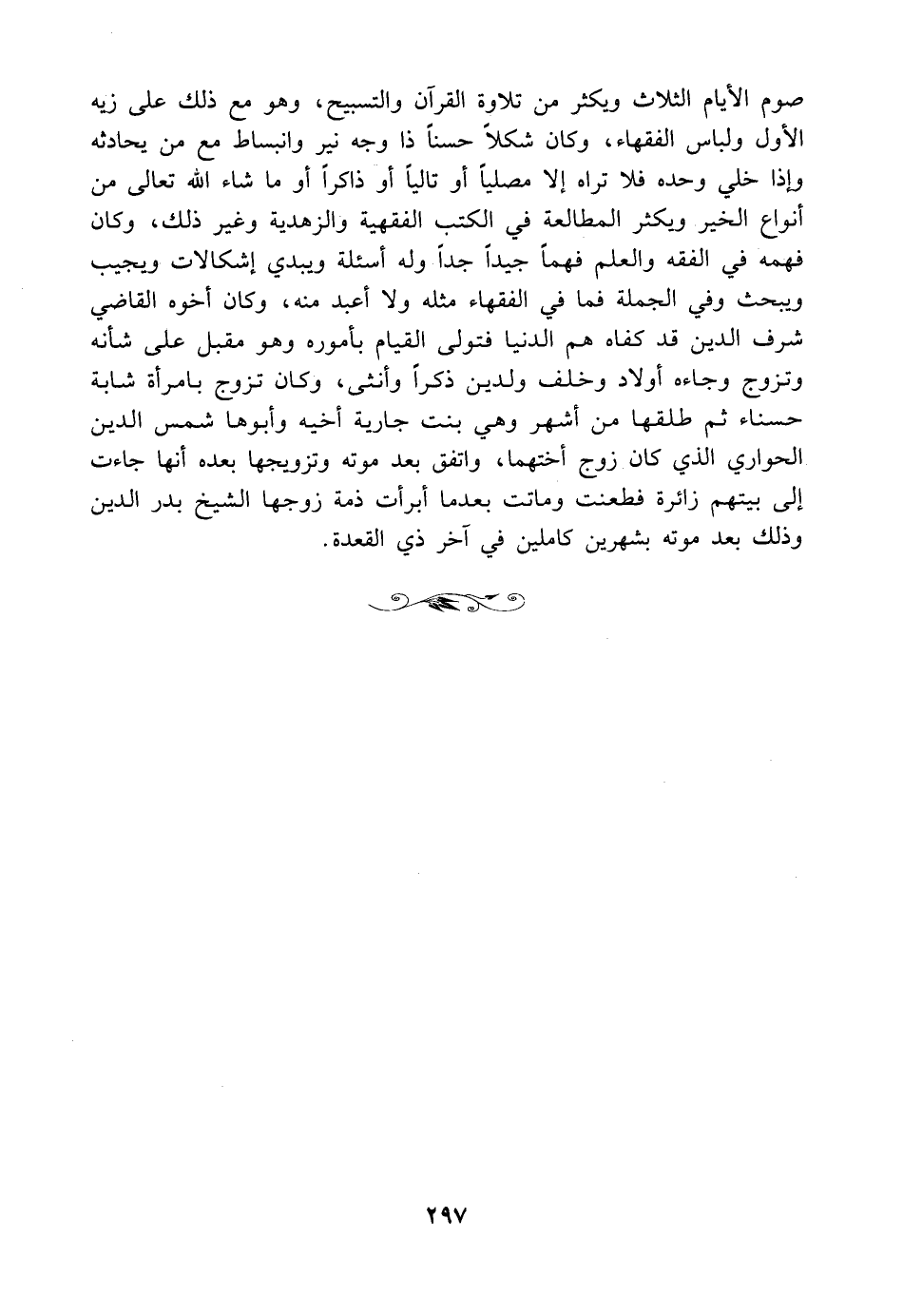 صوم الأيام الثلاث ويكثر من تلاوة القرآن والتسبيح، وهو مع ذلك على زيه الأول ولباس الفقهاء، وكان شكلًا حسنًا ذا وجه نير وانبساط مع من يحادثه وإذا خلي وحده فلا تراه إلا مصليًا أو تاليًا أو ذاكرًا أو ما شاء الله تعالى من أنواع الخير ويكثر المطالعة في الكتب الفقهية والزهدية وغير ذلك، وكان فهمه في الفقه والعلم فهمًا جيدًا جدًا وله أسئلة ويبدي إشكالات ويجيب ويبحث وفي الجملة فما في الفقهاء مثله ولا أعبد منه، وكان أخوه القاضي شرف الدين قد كفاه هم الدنيا فتولى القيام بأموره وهو مقبل على شأنه وتزوج وجاءه أولاد وخلف ولدين ذكرًا وأنثى، وكان تزوج بامرأة شابة حسناء ثم طلقها من أشهر وهي بنت جارية أخيه وأَبوها شمس الدين الحواري الذي كان زوج أختهما، واتفق بعد موته وتزويجها بعده أنها جاءت إلى بيتهم زائرة فطعنت وماتت بعدما أبرأت ذمة زوجها الشيخ بدر الدين وذلك بعد موته بشهرين كاملين في آخر ذي القعدة.