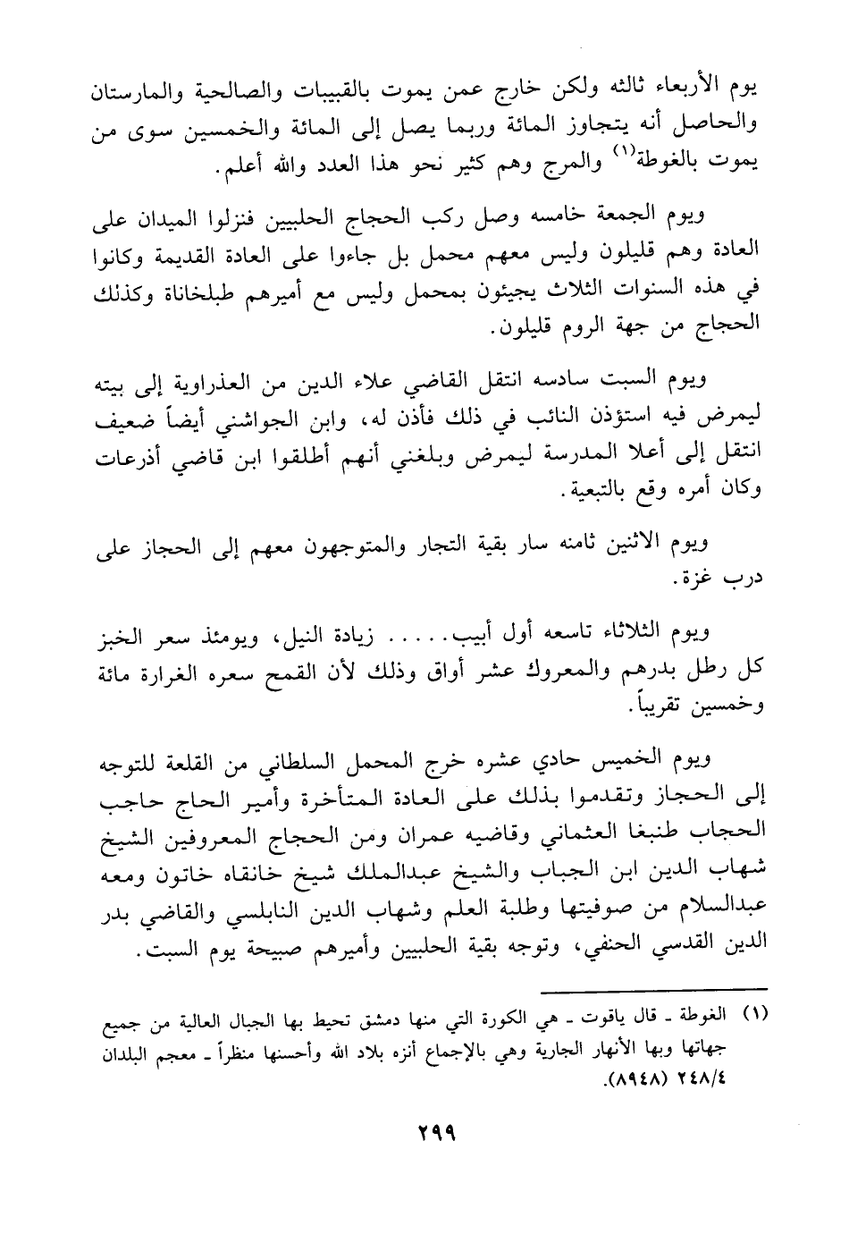 ويوم الجمعة خامسه وصل ركب الحجاج الحلبيين فنزلوا الميدان على العادة وهم قليلون وليس معهم محمل بل جاءوا على العادة القديمة وكانوا في هذه السنوات الثلاث يجيئون بمحمل وليس مع أميرهم طبلخاناة وكذلك الحجاج من جهة الروم قليلون.