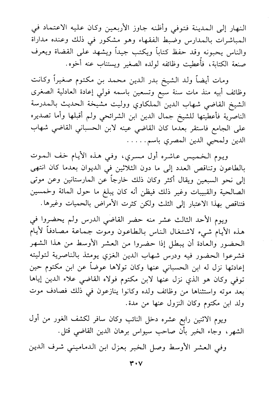ويوم الأحد الثالث عشر منه حضر القاضي الدرس ولم يحضروا في هذه الأيام شيء لاشتغال الناس بالطاعون وموت جماعة مصادفًا لأيام الحضور والعادة أن يبطل إذا حضروا من العشر الأوسط من هذا الشهر فشرعوا الحضور فيه ودرس شهاب الدين الغزي يومئذ بالناصرية لتوليته إعادتها نزل له ابن الحسباني عنها وكان تولاها عوضًا عن ابن مكتوم حين توفي وكان هو الذي نزل عنها لابن مكتوم فولاه القاضي علاء الدين إياها بعد موته واستثناها من وظائف ولده وكاضوا ينازعون في ذلك فصادف موت ولد ابن مكتوم وكان النزول عنها من مدة.