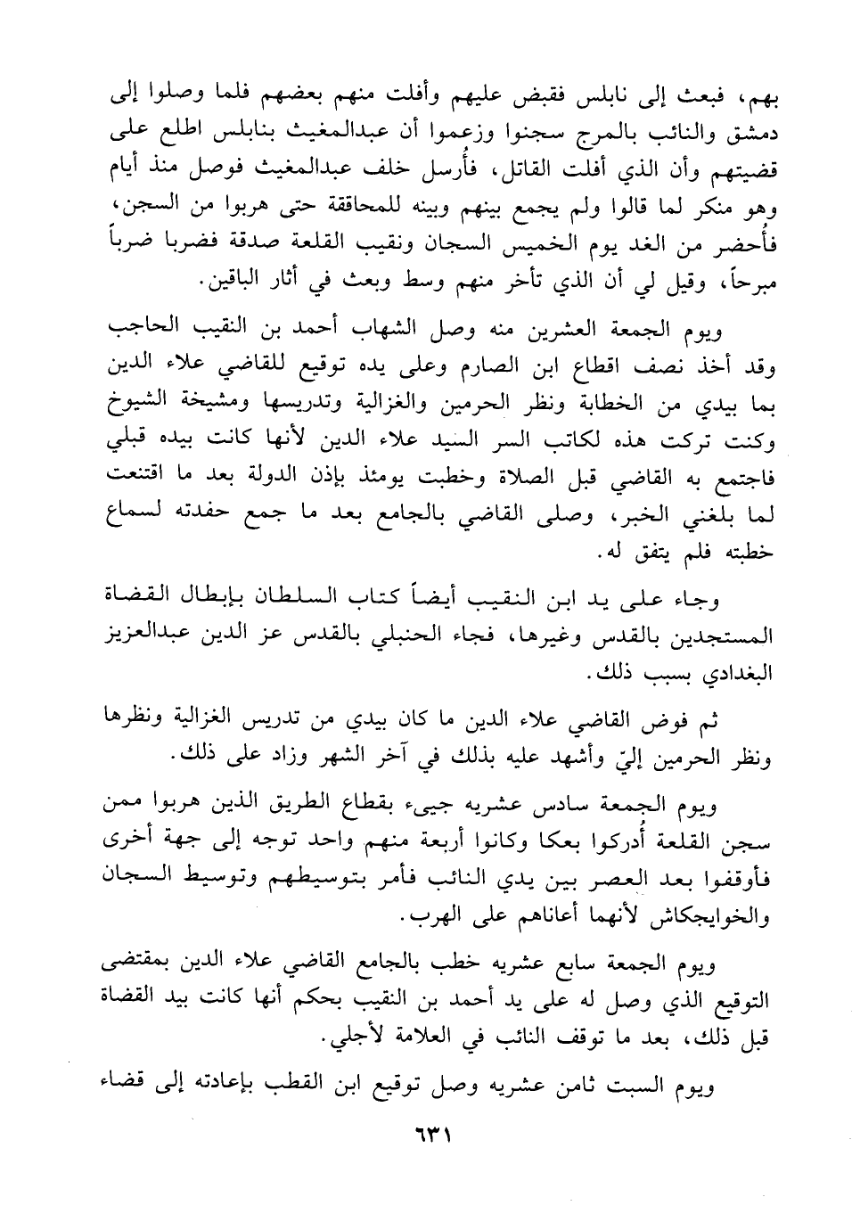 بهم، فبعث إلى نابلس فقبض عليهم وأفلت منهم بعضهم فلما وصلوا إلى دمشق والنائب بالمرج سجنوا وزعموا أن عبد المغيث بنابلس اطلع على قضيتهم وأن الذي أفلت القاتل، فأُرسل خلف عبد المغيث فوصل منذ أيام وهو منكر لما قالوا ولم يجمع بينهم وبينه للمحاققة حتى هربوا من السجن، فأُحضر من الغد يوم الخميس السجان ونقيب القلعة صدقة فضربا ضربًا مبرحًا، وقيل لي أن الذي تأخر منهم وسط وبعث في آثار الباقين.