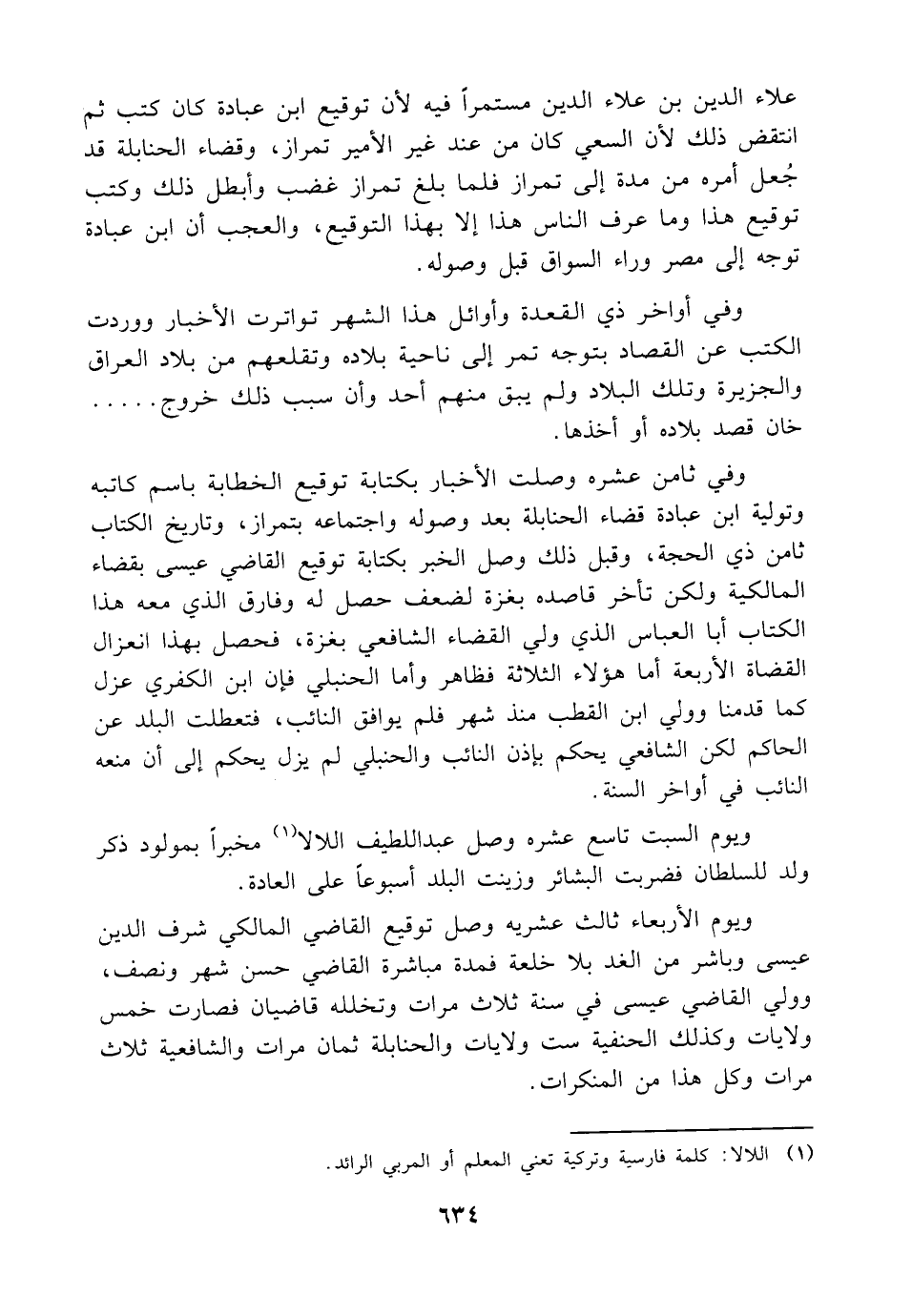 علاء الدين بن علاء الدين مستمرًا فيه لأن توقيع ابن عبادة كان كتب ثم انتقض ذلك لأن السعي كان من عند غير الأمير تمراز، وقضاء الحنابلة قد جُعل أمره من مدة إلى تمراز فلما بلغ تمراز غضب وأبطل ذلك وكتب توقيع هذا وما عرف الناس هذا إلا بهذا التوقيع، والعجب أن ابن عبادة توجه إلى مصر وراء السواق قبل وصوله.