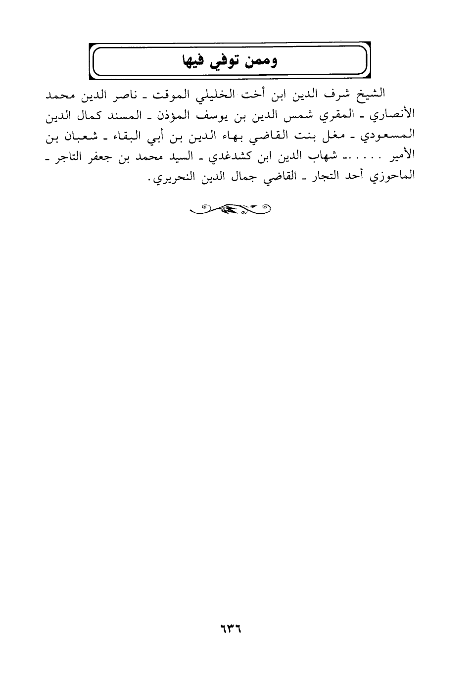 الشيخ شرف الدين ابن أخت الخليلي الموقت - ناصر الدين محمد الأنصاري - المقري شمس الدين بن يوسف المؤذن - المسند كمال الدين المسعودي - مغل بنت القاضي بهاء الدين بن أبي البقاء - شعبان بن الأمير ..... - شهاب الدين ابن كشدغدي - السيد محمد بن جعفر التاجر - الماحوزي أحد التجار - القاضي جمال الدين النحريري.