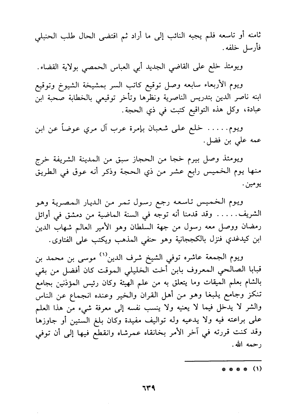 ويوم الأربعاء سابعه وصل توقيع كاتب السر بمشيخة الشيوخ وتوقيع ابنه ناصر الدين بتدريس الناصرية ونظرها وتأخر توقيعي بالخطابة صحبة ابن عبادة، وكل هذه التواقيع كتبت في ذي الحجة.