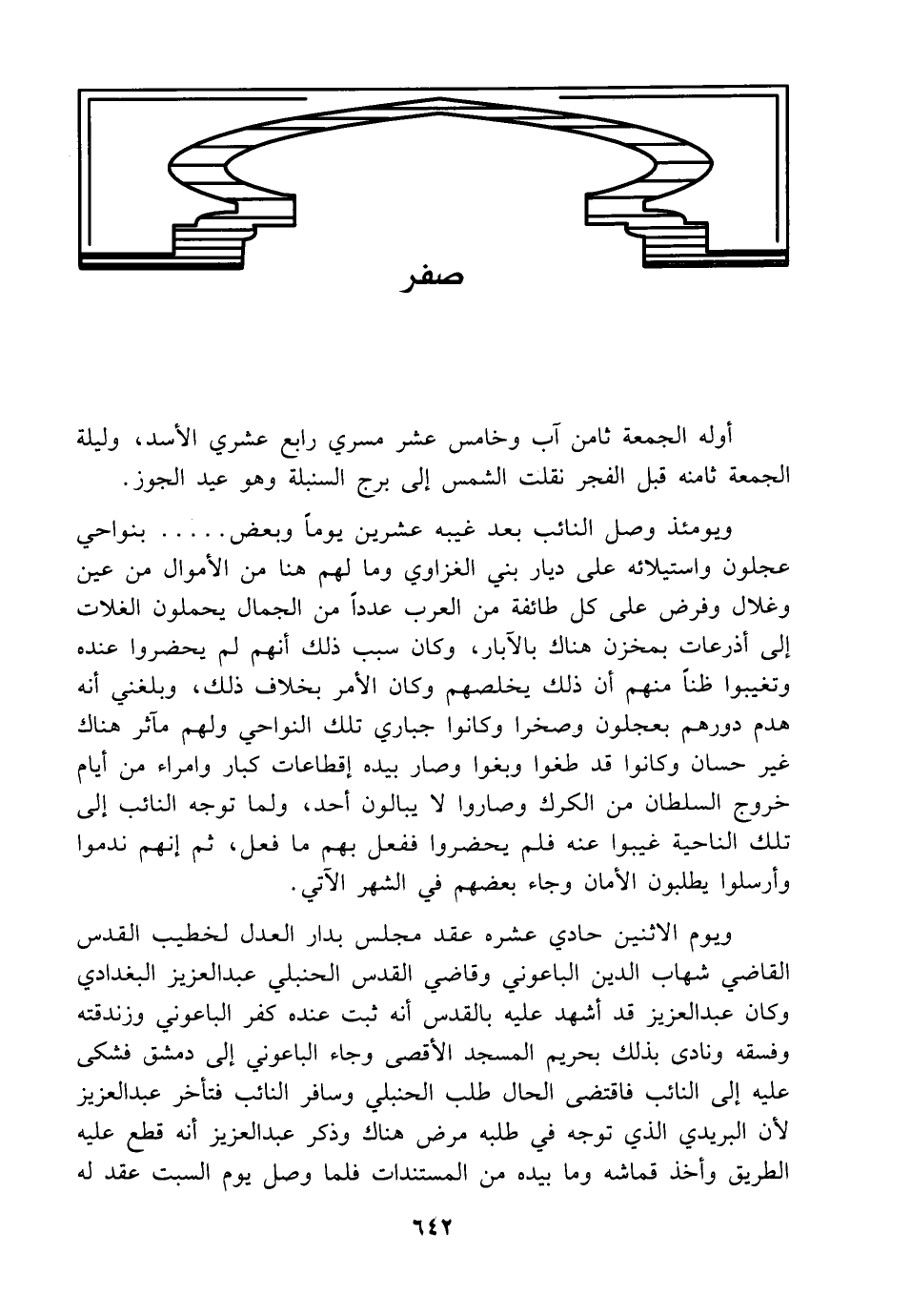 ويومئذ وصل النائب بعد غيبه عشرين يومًا وبعض ..... بنواحي عجلون واستيلائه على ديار بني الغزاوي ومالهم هنا من الأموال من عين وغلال وفرض على كل طائفة من العرب عددًا من الجمال يحملون الغلات إلى أذرعات بمخزن هناك بالآبار، وكان سبب ذلك أنهم لم يحضروا عنده وتغيبوا ظنًا منهم أن ذلك يخلصهم وكان الأمر بخلاف ذلك، وبلغني أنه هدم فى ورهم بحجلون وصخرا وكانوا جباري تلك النواحي ولهم مآثر هناك غير حسان وكانوا قد طغوا وبغوا وصار بيده إقطاعات كبار وأمراء من أيام خروج السلطان من الكرك وصاروا لا يبالون أحد، ولما توجه النائب إلى تلك الناحية غيبوا عنه فلم يحضروا ففعل بهم ما فعل، ثم إنهم ندموا وأرسلوا يطلبون الأمان وجاء بعضهم في الشهر الآتي.