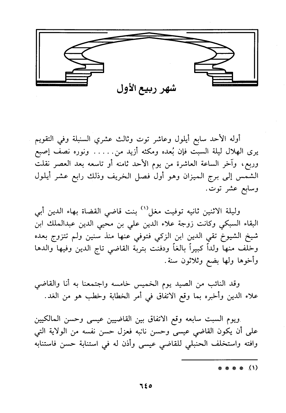 أوله الأحد سابع أيلول وعاشر توت وثالث عشري السنبلة وفي التقويم يرى الهلال ليلة السبت فإن بُعده ومكثه أزيد من ..... ونوره نصف إصبع وربع، وآخر الساعة العاشرة من يوم الأحد ثامنه أو تاسعه بعد العصر نقلت الشمس إلى برج الميزان وهو أول فصل الخريف وذلك رابع عشر أيلول وسابع عشر توت.