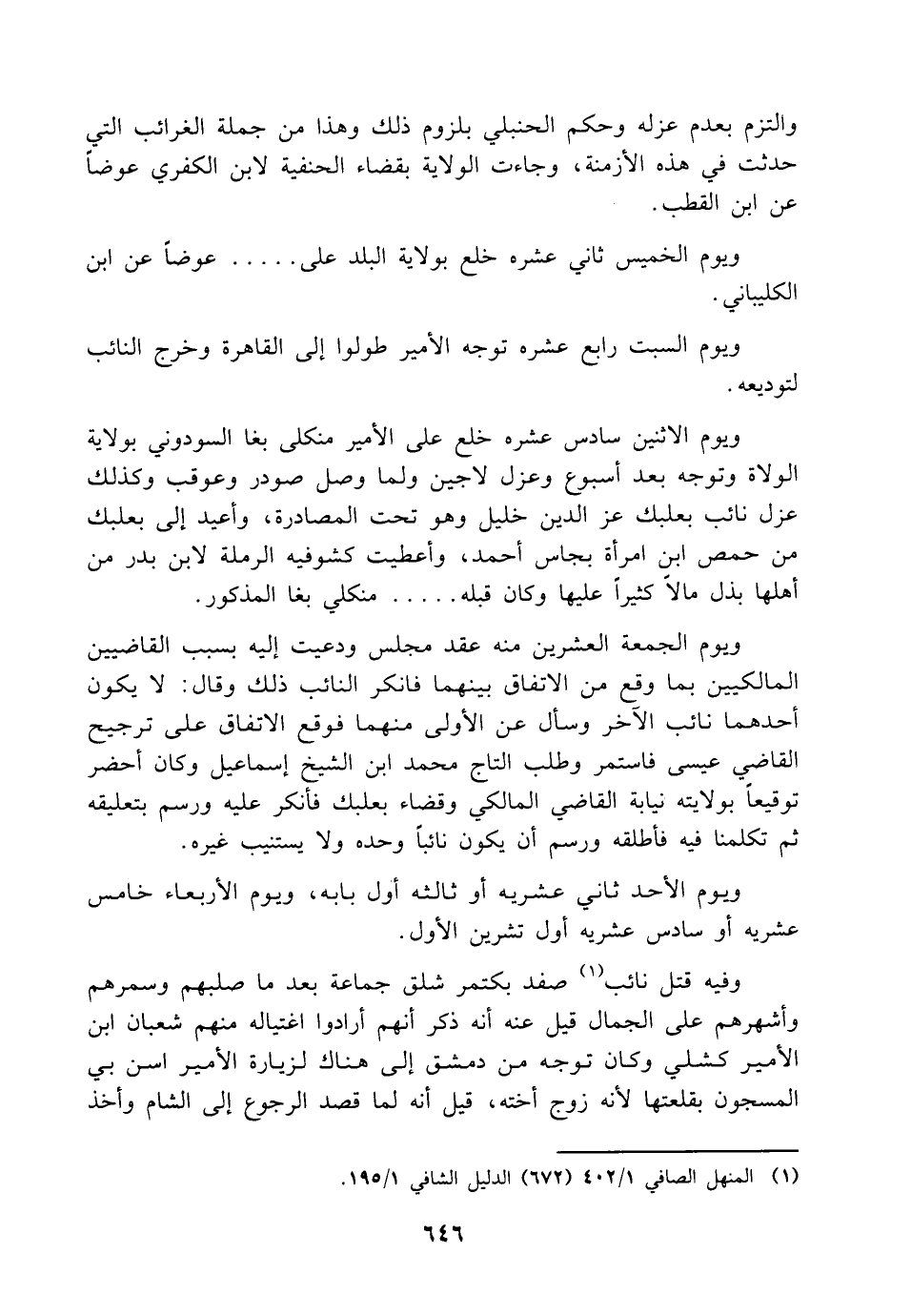 ويوم الاثنين سادس عشره خلع على الأمير منكلى بغا السودوني بولاية الولاة وتوجه بعد أسبوع وعزل لاجين ولما وصل صودر وعوقب وكذلك عزل نائب بعلبك عز الدين خليل وهو تحت المصادرة، وأعيد إلى بعلبك من حمص ابن امرأة بجاس أحمد، وأعطيت كشوفيه الرملة لابن بدر من أهلها بذل مالًا كثيرًا عليها وكان قبله ..... منكلي بغا المذكور.
