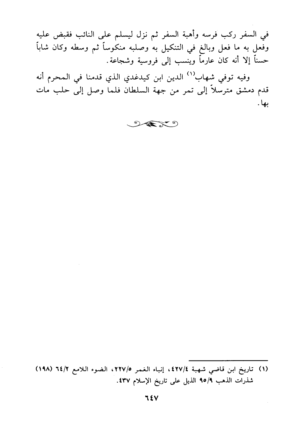 (¬1) تاريخ ابن قاضي شهبة 4/ 427، إنباء الغمر 5/ 227، الضوء اللامع 2/ 64 (198) شذرات الذهب 9/ 95 الذيل على تاريخ الإسلام 437.