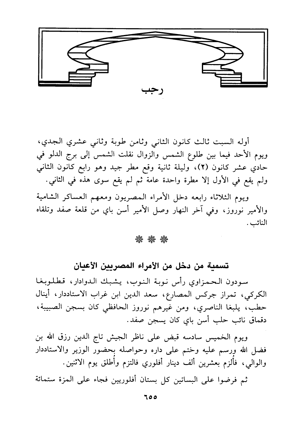 ويوم الثلاثاء رابعه دخل الأمراء المصريون ومعهم العساكر الشامية والأمير نوروز، وفي آخر النهار وصل الأمير أسن باي من قلعة صفد وتلقاه النائب.