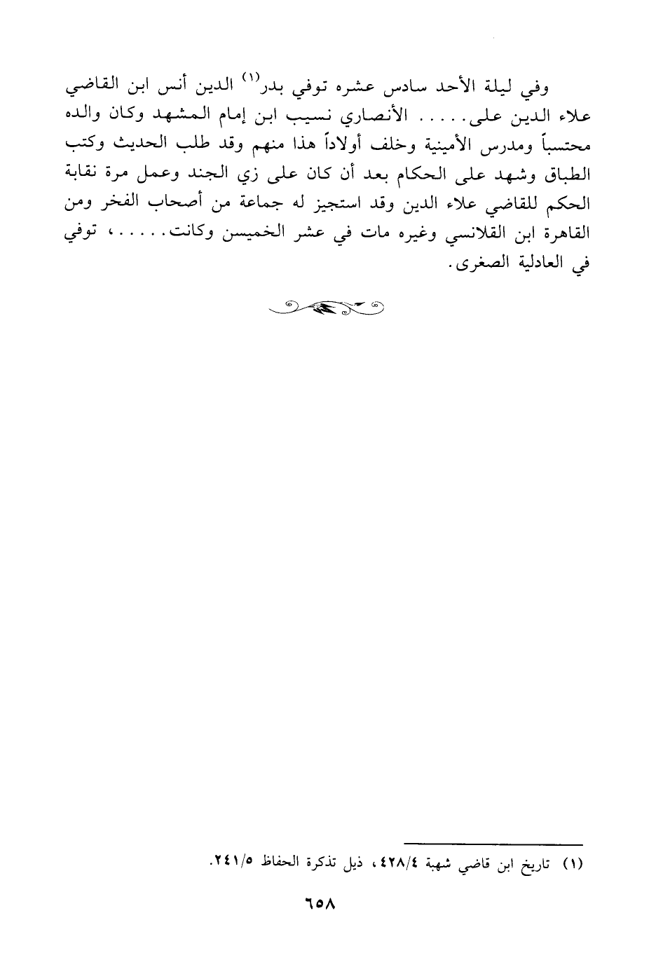 وفي ليلة الأحد سادس عشره توفي بدر (¬1) الدين أنس ابن القاضي علاء الدين على ..... الأنصاري نسيب ابن إمام المشهد وكان والده محتسباً ومدرس الأمينية وخلف أولاداً هذا منهم وقد طلب الحديث وكتب الطباق وشهد على الحكام بعد أن كان على زي الجند وعمل مرة نقابة الحكم للقاضي علاء الدين وقد استجيز له جماعة من أصحاب الفخر ومن القاهرة ابن القلانسي وغيره مات في عشر الخميسن وكانت ..... ، توفي في العادلية الصغرى.