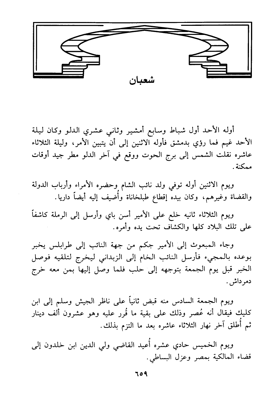 ويوم الخميس حادي عشره أُعيد القاضي ولي الدين ابن خلدون إلى قضاء المالكية بمصر وعزل البساطي.