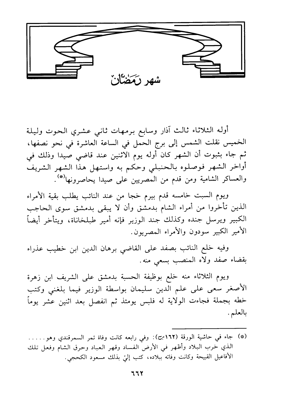 أوله الثلاثاء ثالث آذار وسابع برمهات ثاني عشري الحوت وليلة الخميس نقلت الشمس إلى برج الحمل في الساعة العاشرة في نحو نصفها، ثم جاء بثبوت أن الشهر كان أوله يوم الاثنين عند قاضي صيدا وذلك في أواخر الشهر فوصلوه بالحنبلي وحكم به واستهل هذا الشهر الشريف والعساكر الشامية ومن قدم من المصريين على صيدا يحاصرونها (*).