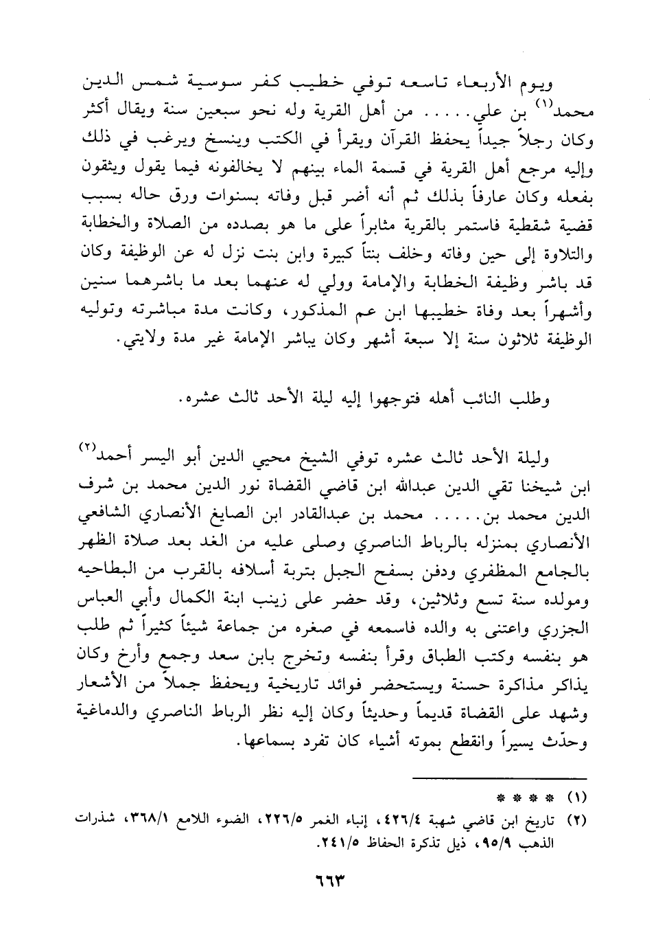 ويوم الأربعاء تاسعه توفي خطيب كفر سوسية شمس الدين محمد (¬1) بن علي ..... من أهل القرية وله نحو سبعين سنة ويقال أكثر وكان رجلاً جيداً يحفظ القرآن ويقرأ في الكتب وينسخ ويرغب في ذلك وإليه مرجع أهل القرية في قسمة الماء بينهم لا يخالفونه فيما يقول ويثقون بفعله وكان عارفاً بذلك ثم أنه أضر قبل وفاته بسنوات ورق حاله بسبب قضية شقطية فاستمر بالقرية مثابراً على ما هو بصدده من الصلاة والخطابة والتلاوة إلى حين وفاته وخلف بنتاً كبيرة وابن بنت نزل له عن الوظيفة وكان قد باشر وظيفة الخطابة والإمامة وولى له عنهما بعد ما باشرهما سنين وأشهراً بعد وفاة خطيبها ابن عم المذكور، وكانت مدة مباشرته وتوليه الوظيفة ثلاثون سنة إلا سبعة أشهر وكان يباشر الإمامة غير مدة ولايتي.