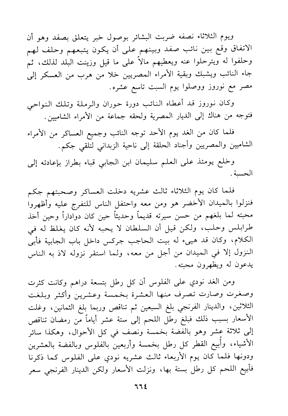 ومن الغد نودي على الفلوس أن كل رطل بتسعة دراهم وكانت كثرت وصغرت وصارت تصرف منها العشرة بخمسة وعشرين وأكثر وبلغت الثلاثين، والدينار الفرنجي بلغ السبعين ثم تناقص وربما بلغ الثمانين، وغلت الأسعار بسبب ذلك فبلغ رطل اللحم إلى ستة عشر أياماً من رمضان تناقص إلى ثلاثة عشر وهو بالفضة بخمسة ونصف في كل الأحوال، وهكذا سائر الأشياء، وأُبيع القطر كل رطل بخمسة وأربعين بالفلوس وبالفضة بالعشرين ودونها فلما كان يوم الأربعاء ثالث عشريه نودي على الفلوس كما ذكرنا فأبيع اللحم كل رطل بستة بها، ونزلت الأسعار ولكن الدينار الفرنجي سعر