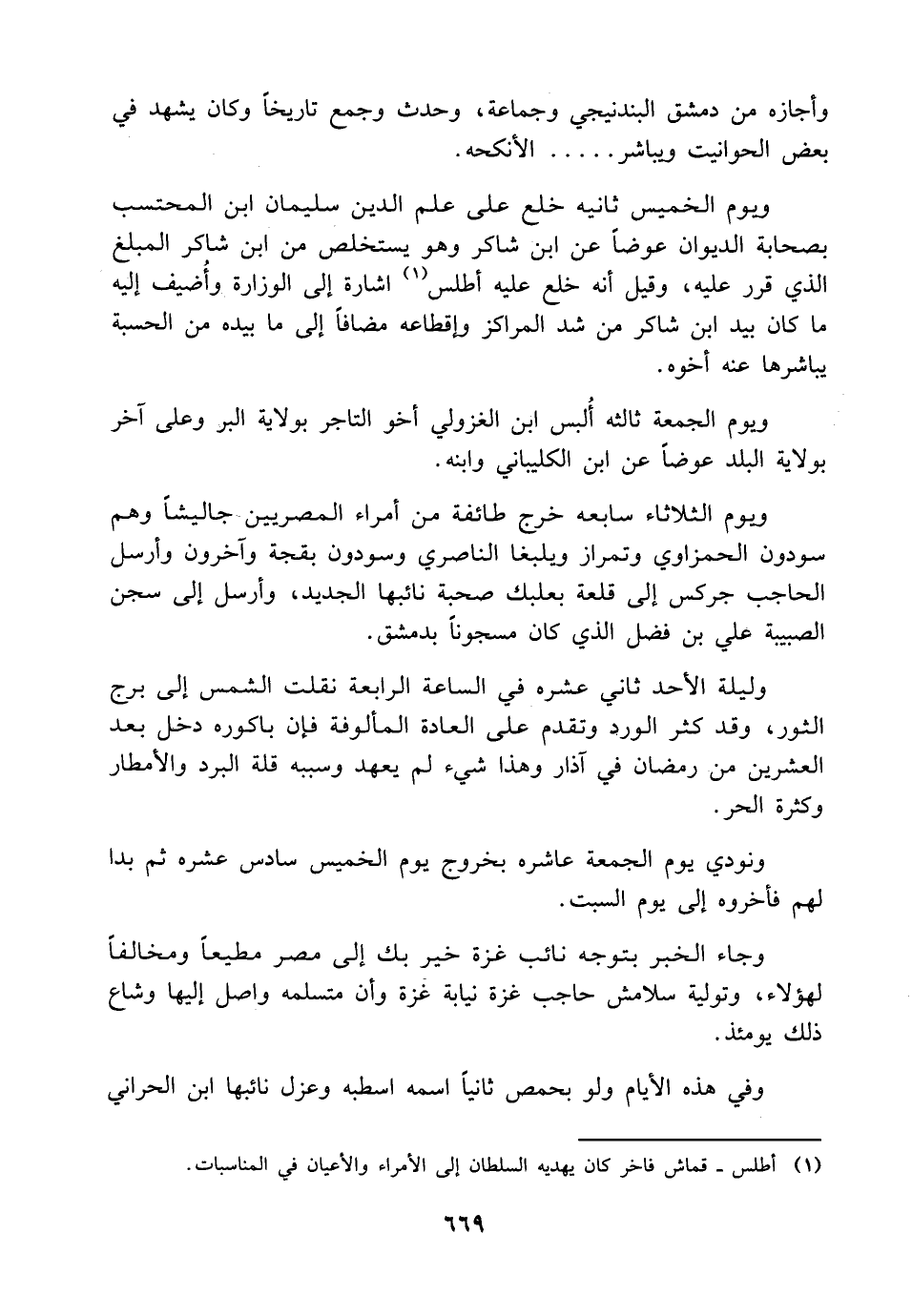 ويوم الخميس ثانيه خلع على علم الدين سليمان ابن المحتسب بصحابة الديوان عوضاً عن ابن شاكر وهو يستخلص من ابن شاكر المبلغ الذي قرر عليه، وقيل أنه خلع عليه أطلس (¬1) إشارة إلى الوزارة وأُضيف إليه ما كان بيد ابن شاكر من شد المراكز وإقطاعه مضافاً إلى ما بيده من الحسبة يباشرها عنه أخوه.