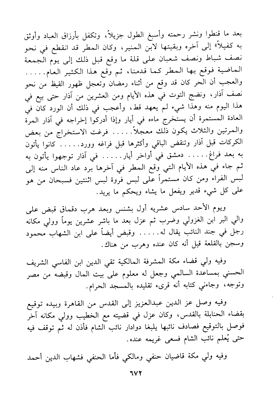 بعد ما قنطوا ونشر رحمته وأسبغ الطول جزيلاً، وتكفل بأرزاق العباد وأوثق به كفيلاً" إلى آخره وبقيتها لابن المنير، وكان المطر قد انقطع في نحو نصف شباط ونصف شعبان على قلة ما وقع قبل ذلك إلى يوم الجمعة الماضية فوقع بها المطر كما قدمنا، ثم وقع هذا الكثير العام ..... والعجب أن الحر كان قد وقع من أثناء رمضان وتعجل ظهور القيظ من نحو نصف آذار، ونضج التوت في هذه الأيام ومن العشرين من آذار حتى بيع في هذا اليوم منه وهذا شيء لم يعهد قط، وأعجب في ذلك أن الورد كان في العادة المستمرة أن يستخرج ماءه في أيار وإذا أدركوا إخراجه في آذار المرة والمرتين والثلاث يكون ذلك معجلاً ..... فرغت الاستخراج من بعض الكركات قبل آذار وتنقض الباقي وأكثرها قبل فراغه وورد ..... كانوا يأتون به بعد فراغ ..... دمشق في أواخر أيار ..... في آذار توجهوا يأتون به ثم جاء في هذه الأيام التي وقع المطر في آخرها برد عاد الناس منه إلى لبس الفراء ومن كان مستمراً على لبس فروة لبس اثنتين فسبحان من هو على كل شيء قدير ويفعل ما يشاء ويحكم ما يريد.