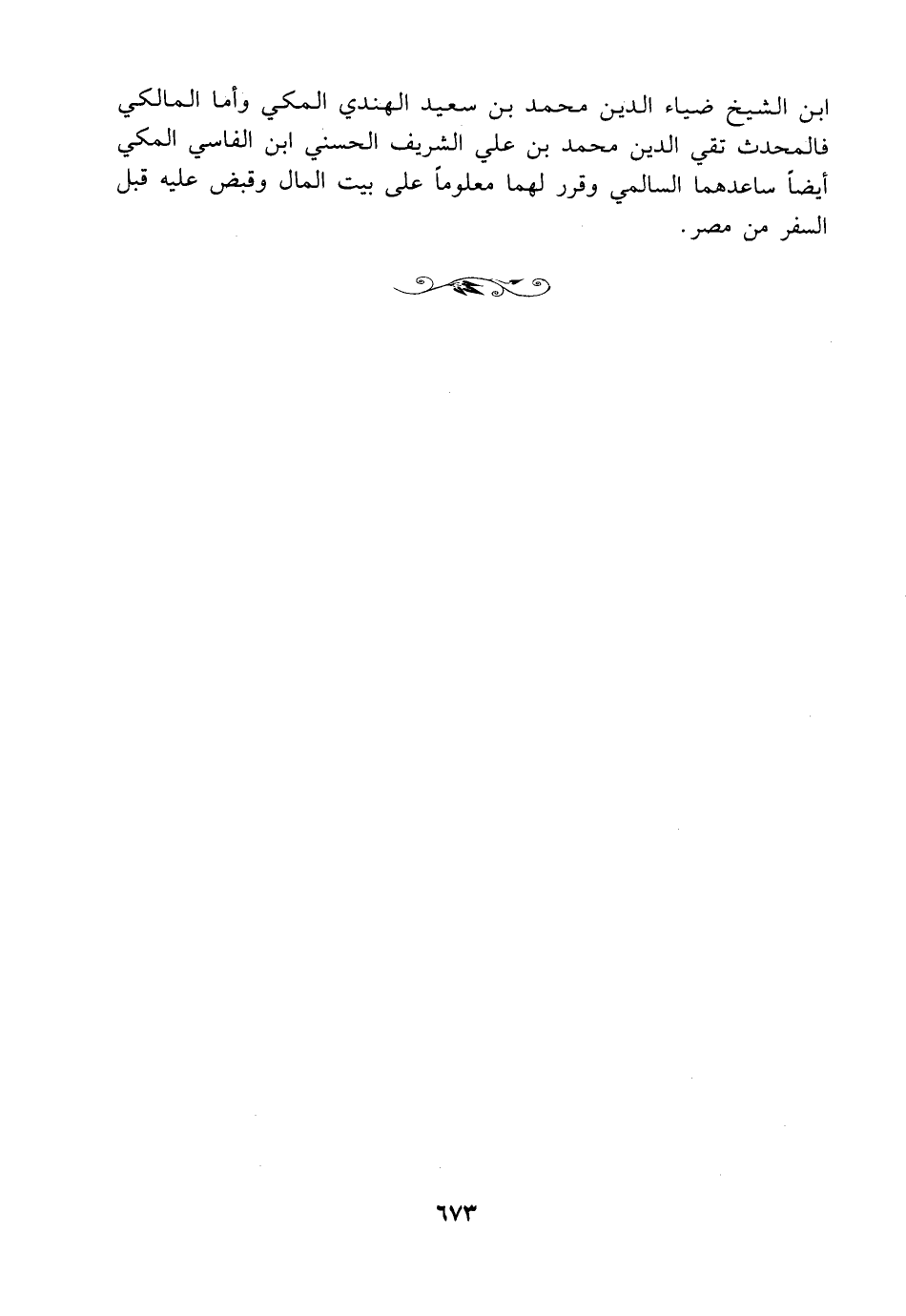 ابن الشيخ ضياء الدين محمد بن سعيد الهندي المكي وأما المالكي فالمحدث تقي الدين محمد بن علي الشريف الحسني ابن الفاسي المكي أيضاً ساعدهما السالمي وقرر لهما معلوماً على بيت المال وقبض عليه قبل السفر من مصر.