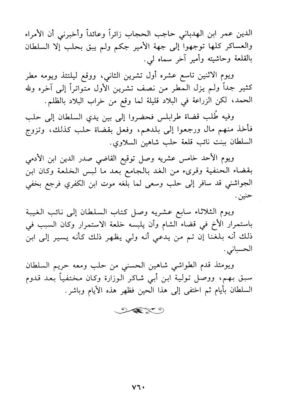 الدين عمر ابن الهدباني حاجب الحجاب زائرًا وعائدًا وأخبرني أن الأمراء والعساكر كلها توجهوا إلى جهة الأمير جكم ولم يبق بحلب إلا السلطان بالقلعة وحاشيته وأمير آخر سماه لي.