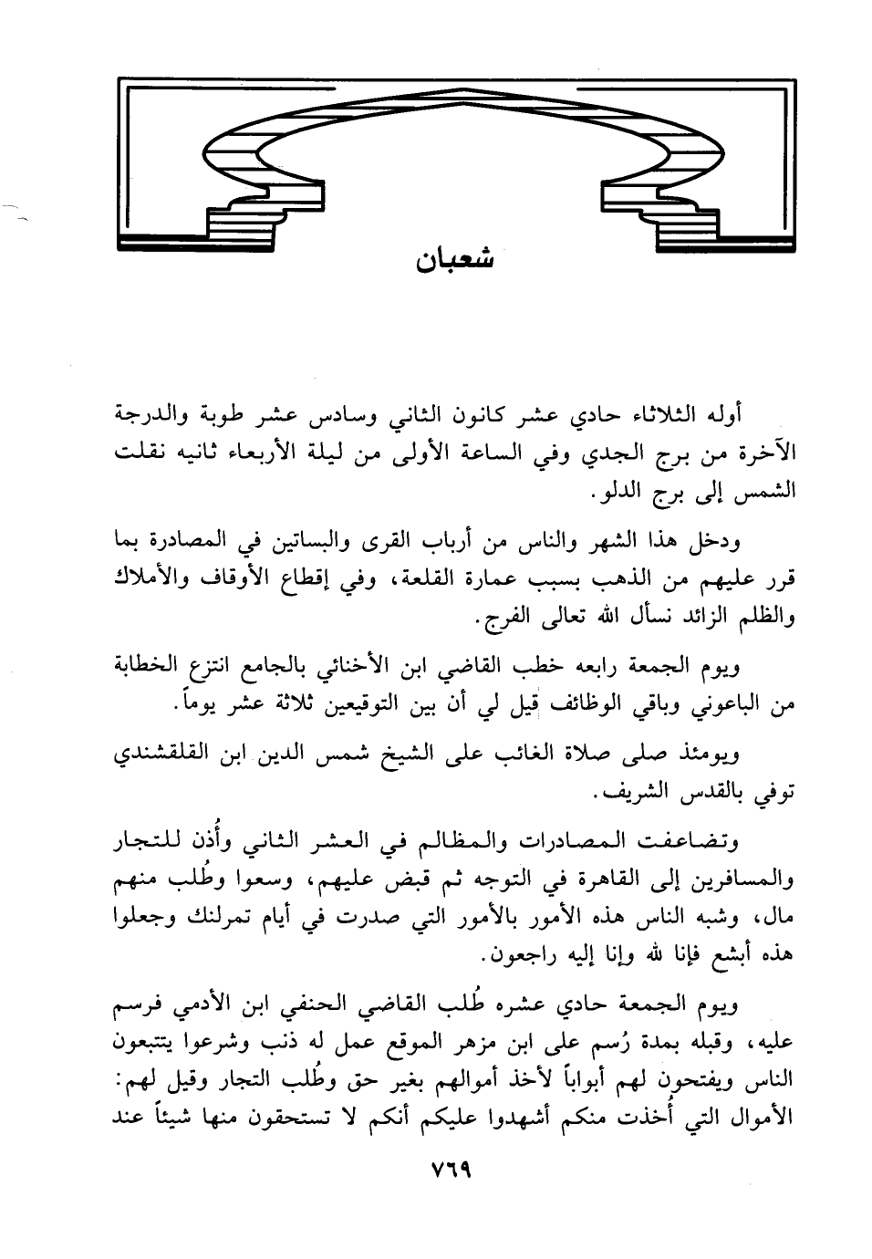 ودخل هذا الشهر والناس من أرباب القرى والبساتين في المصادرة بما قرر عليهم من الذهب بسبب عمارة القلعة، وفي إقطاع الأوقاف والأملاك والظلم الزائد نسأل الله تعالى الفرج.
