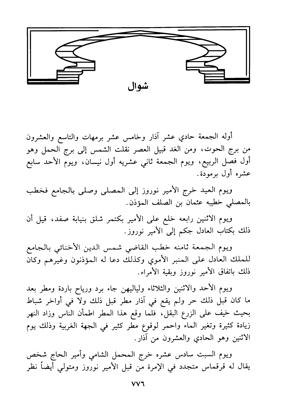 ولوم العيد خرج الأمير نوروز إلى المصلى وصلى بالجامع فخطب بالمصلي خطيبه عثمان بن الصلف المؤذن.