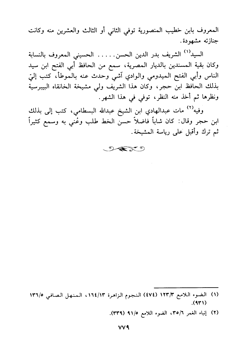 السيد (¬1) الشريف بدر الدين الحسن ..... الحسيني المعروف بالنسابة وكان بقية المسندين بالديار المصرية، سمع من الحافظ أبي الفتح ابن سيد الناس وأبي الفتح الميدومي والوادي آشي وحدث عنه بالموطأ، كتب إليّ بذلك الحافظ ابن حجر، وكان هذا الشريف ولي مشيخة الخانقاه البيبرسية ونظرها ثم أخذ منه النظر، توفي في هذا الشهر.