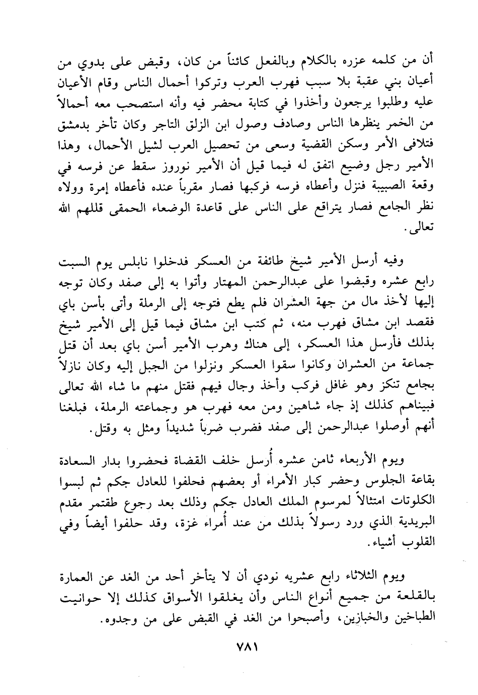 أن من كلمه عزره بالكلام وبالفعل كائنًا من كان، وقبض على بدوي من أعيان بني عقبة بلا سبب فهرب العرب وتركوا أحمال الناس وقام الأعيان عليه وطلبوا يرجعون وأخذوا في كتابة محضر فيه وأنه استصحب معه أحمالًا من الخمر ينظرها الناس وصادف وصول ابن الزلق التاجر وكان تأخر بدمشق فتلافى الأمر وسكن القضية وسعى من تحصيل العرب لشيل الأحمال، وهذا الأمير رجل وضيع اتفق له فيما قيل أن الأمير نوروز سقط عن فرسه في وقعة الصبيبة فنزل وأعطاه فرسه فركبها فصار مقربًا عنده فأعطاه إمرة وولاه نظر الجامع فصار يتراقع على الناس على قاعدة الوضعاء الحمقى قللهم الله تعالى.
