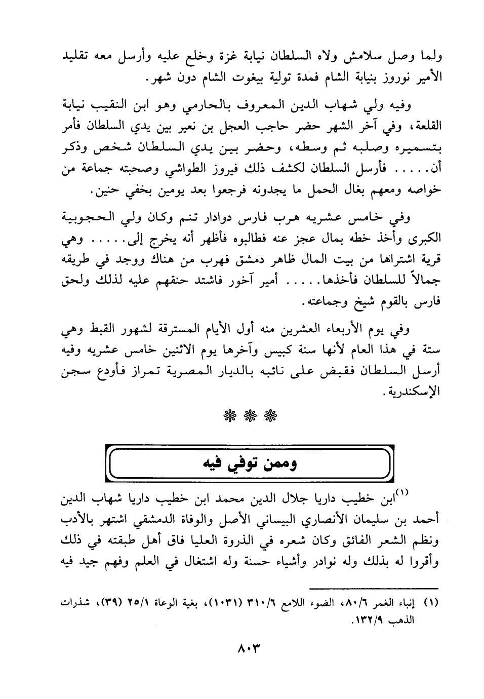 وفي خامس عشريه هرب فارس دوادار تنم وكان ولي الحجوبية الكبرى وأخذ خطه بمال عجز عنه فطالبوه فأظهر أنه يخرج إلى ..... وهي قرية اشتراها من بيت المال ظاهر دمشق فهرب من هناك ووجد في طريقه جمالاً للسلطان فأخذها ..... أمير آخور فاشتد حنقهم عليه لذلك ولحق فارس بالقوم شيخ وجماعته.