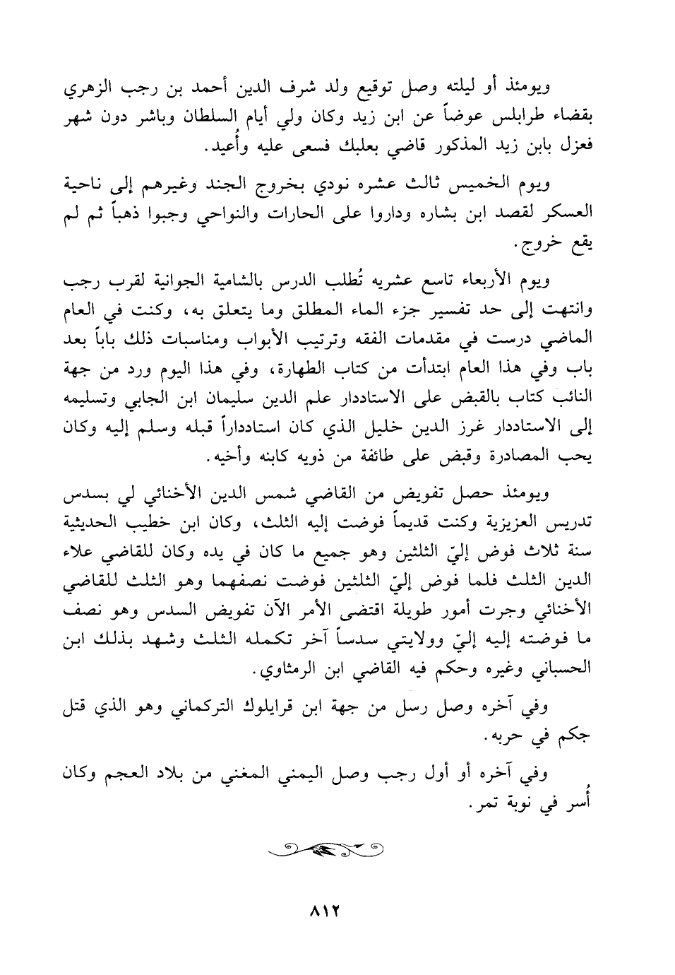 ويومئذ أو ليلته وصل توقيع ولد شرف الدين أحمد بن رجب الزهري بقضاء طرابلس عوضاً عن ابن زيد وكان ولي أيام السلطان وباشر دون شهر فعزل بابن زيد المذكرر قاضي بعلبك فسعى عليه وأُعيد.