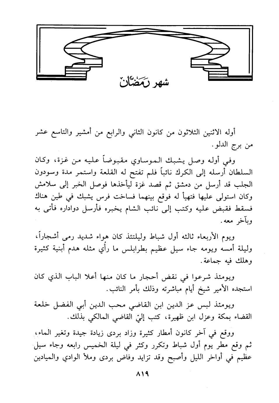 ووقع في آخر كانون أمطار كثيرة وزاد بردى زيادة جيدة وتغير الماء، ثم وقع مطر يوم أول شباط وتكرر وكثر في ليلة الخميس رابعه وجاء سيل عظيم في أواخر الليل وأصبح وقد تزايد وفاض بردى وملأ الوادي والميادين