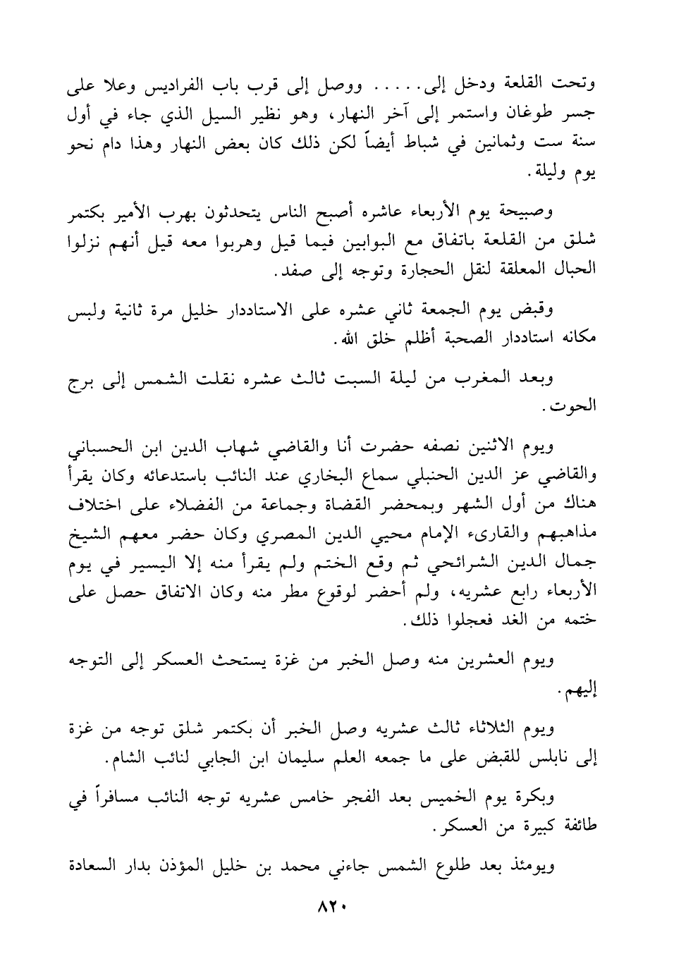 ويوم الاثنين نصفه حضرت أنا والقاضي شهاب الدين ابن الحسباني والقاضي عز الدين الحنبلي سماع البخاري عند النائب باستدعائه وكان يقرأ هناك من أول الشهر وبمحضر القضاة وجماعة من الفضلاء على اختلاف مذاهبهم والقارئ الإمام محيي الدين المصري وكان حضر معهم الشيخ جمال الدين الشرائحي ثم وقع الختم ولم يقرأ منه إلا اليسير في يوم الأربعاء رابع عشريه، ولم أحضر لوقوع مطر منه وكان الاتفاق حصل على ختمه من الغد فعجلوا ذلك.