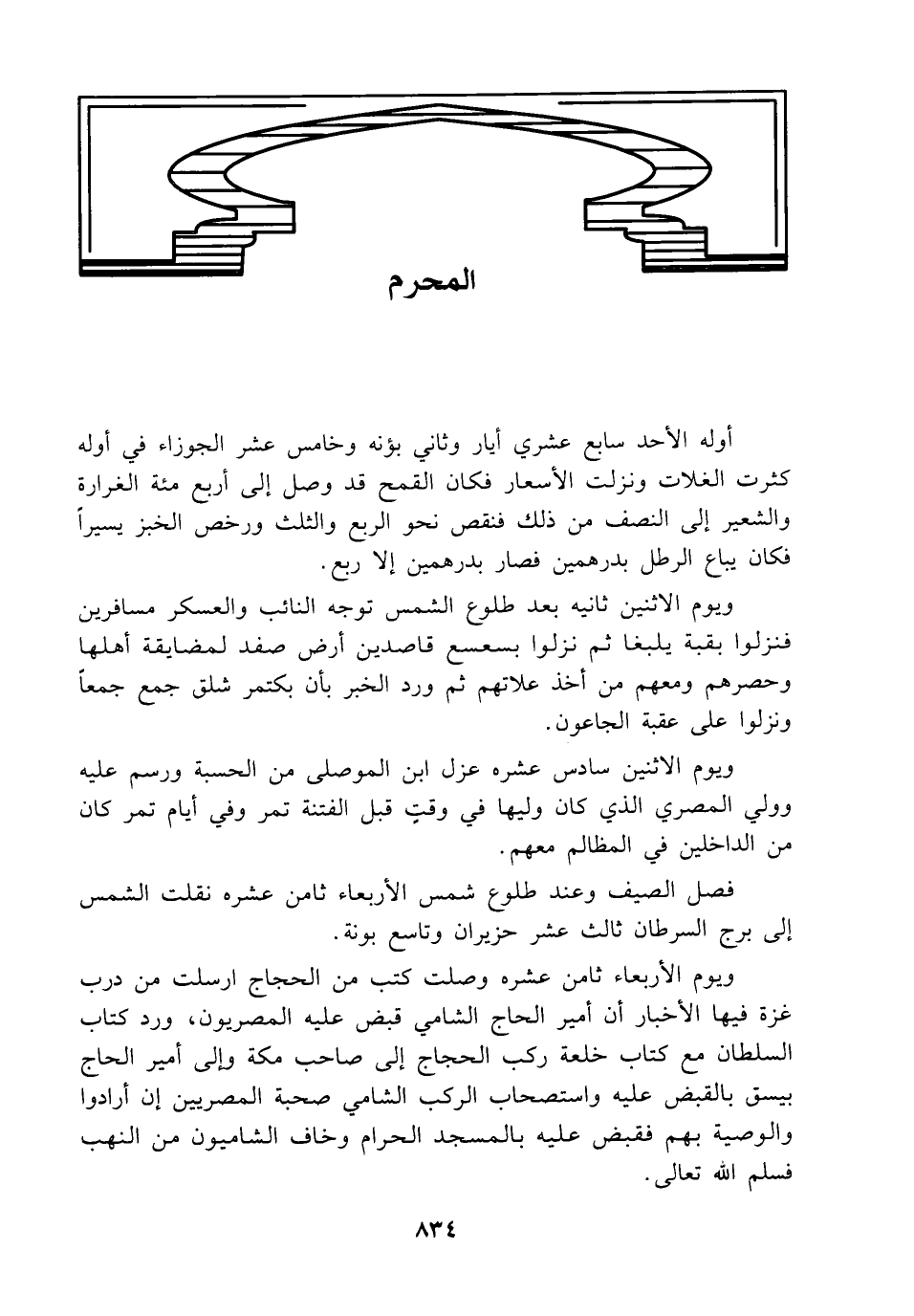 ويوم الأربعاء ثامن عشره وصلت كتب من الحجاج أرسلت من درب غزة فيها الأخبار أن أمير الحاج الشامي قبض عليه المصريون، ورد كتاب السلطان مع كتاب خلعة ركب الحجاج إلى صاحب مكة وإلى أمير الحاج بيسق بالقبض عليه واستصحاب الركب الشامي صحبة المصريين إن أرادوا والوصية بهم فقبض عليه بالمسجد الحرام وخاف الشاميون من النهب فسلم الله تعالى.