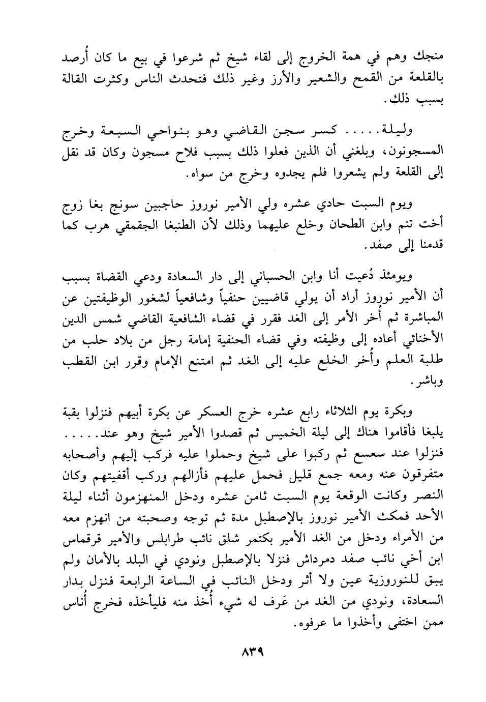 منجك وهم في همة الخروج إلى لقاء شيخ ثم شرعوا في بيع ما كان أُرصد بالقلعة من القمح والشعير والأرز وغير ذلك فتحدث الناس وكثرت المقالة بسبب ذلك.