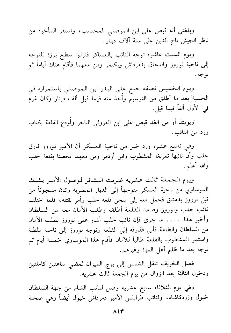 ويوم الجمعة ثالث عشريه ضربت البشائر لوصول الأمير يشبك الموساوي من ناحية العسكر متوجهاً إلى الديار المصرية وكان مسجوناً من قبل نوروز بدمشق فحمل معه إلى سجن قلعة حلب وأمر بقتله، فلما اختلف نائب حلب ونوروز وصعد القلعة أطلقه وطلب الأمان معه من السلطان وأخبر هذا ..... ما جرى فإن نائب حلب أشار على نوروز بطلب الأمان من السلطان والطاعة فأبى ففارقه إلى القلعة وتوجه نوروز إلى ناحية ملطية واستمر المشطوب بالقلعة طالباً للأمان فأقام هذا الموساوي خمسة أيام ثم توجه بعد ما ظلم أهل المزة وغيرهم.