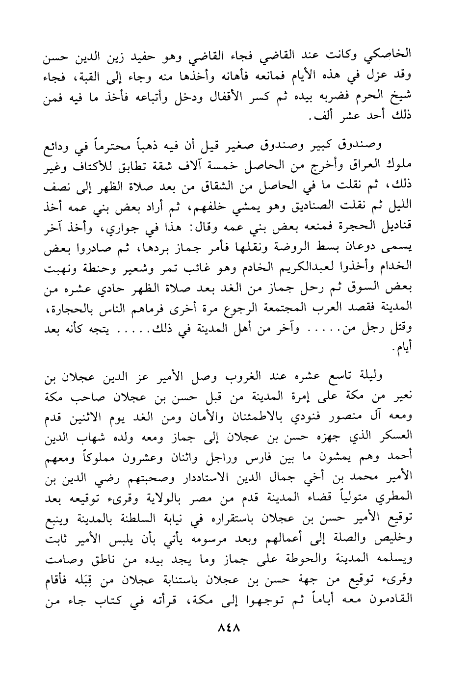 وصندوق كبير وصندوق صغير قيل أن فيه ذهباً محترماً في ودائع ملوك العراق وأخرج من الحاصل خمسة آلاف شقة تطابق للأكتاف وغير ذلك، ثم نقلت ما في الحاصل من الشقاق من بعد صلاة الظهر إلى نصف الليل ثم نقلت الصناديق وهو يمشي خلفهم، ثم أراد بعض بني عمه أخذ قناديل الحجرة فمنعه بعض بني عمه وقال: هذا في جواري، وأخذ آخر يسمى دوعان بسط الروضة ونقلها فأمر جماز بردها، ثم صادروا بعض الخدام وأخذوا لعبد الكريم الخادم وهو غائب تمر وشعير وحنطة ونهبت بعض السوق ثم رحل جماز من الغد بعد صلاة الظهر حادي عشره من المدينة فقصد العرب المجتمعة الرجوع مرة أخرى فرماهم الناس بالحجارة، وقتل رجل من ..... وآخر من أهل المدينة في ذلك ..... يتجه كأنه بعد أيام.