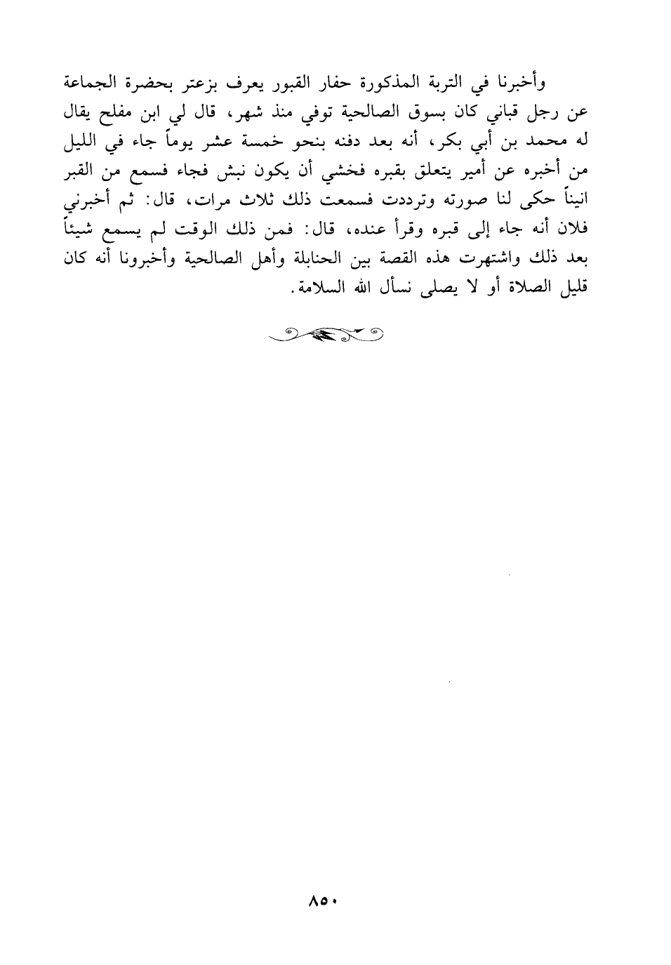 وأخبرنا في التربة المذكورة حفار القبور يعرف بزعتر بحضرة الجماعة عن رجل قباني كان بسوق الصالحية توفي منذ شهر، قال لي ابن مفلح يقال له محمد بن أبي بكر، أنه بعد دفنه بنحو خمسة عشر يوماً جاء في الليل من أخبره عن أمير يتعلق بقبره فخشي أن يكون نبش فجاء فسمع من القبر أنيناً حكى لنا صورته وترددت فسمعت ذلك ثلاث مرات، قال: ثم أخبرني فلان أنه جاء إلى قبره وقرأ عنده، قال: فمن ذلك الوقت لم يسمع شيئًا بعد ذلك واشتهرت هذه القصة بين الحنابلة وأهل الصالحية وأخبرونا أنه كان قليل الصلاة أو لا يصلى نسأل الله السلامة.