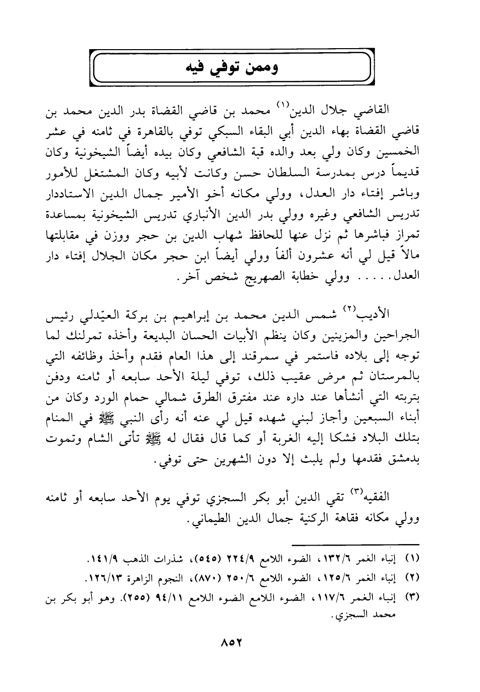(¬3) إنباء الغمر 6/ 117، الضوء اللامع الضوء اللامع 11/ 94 (255). وهو أبو بكر بن محمد السجزي.