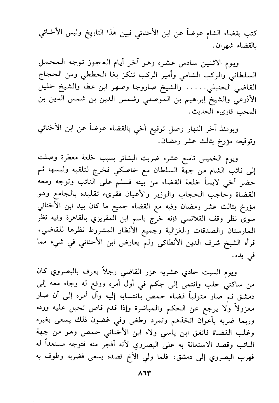 كتب بقضاء الشام عوضاً عن ابن الأخنائي فبين هذا التاريخ ولبس الأخنائي بالقضاء شهران.