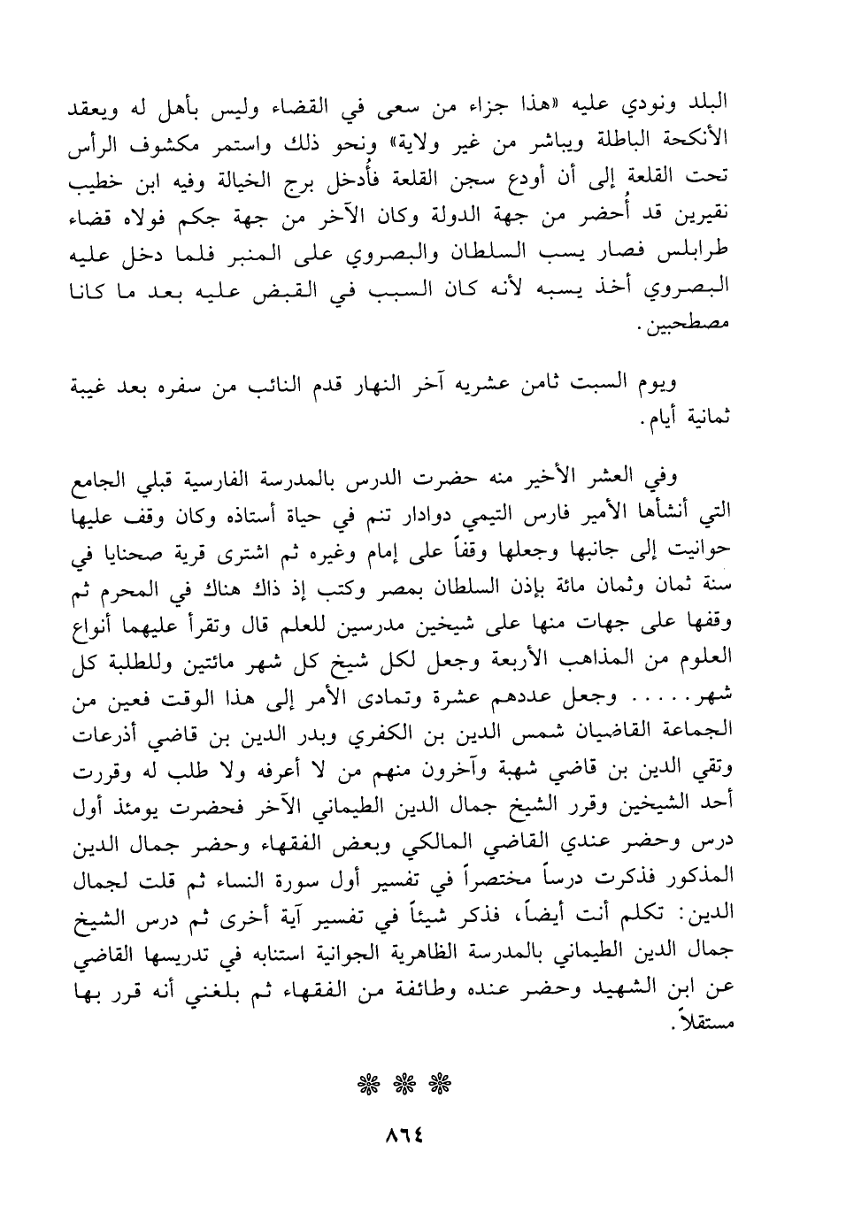 وفي العشر الأخير منه حضرت الدرس بالمدرسة الفارسية قبلي الجامع التي أنشأها الأمير فارس التيمي دوادار تنم في حياة أستاذه وكان وقف عليها حوانيت إلى جانبها وجعلها وقفاً على إمام وغيره ثم اشترى قرية صحنايا في سنة ثمان وثمان مائة بإذن السلطان بمصر وكتب إذ ذاك هناك في المحرم ثم وقفها على جهات منها على شيخين مدرسين للعلم قال وتقرأ عليهما أنواع العلوم من المذاهب الأربعة وجعل لكل شيخ كل شهر مائتين وللطلبة كل شهر ..... وجعل عددهم عشرة وتمادى الأمر إلى هذا الوقت فعين من الجماعة القاش عيان شمس الدين بن الكفري وبدر الدين بن قاضي أذرعات وتقي الدين بن قاضي شهبة وآخرون منهم من لا أعرفه ولا طلب له وقررت أحد الشيخين وقرر الشيخ جمال الدين الطيماني الآخر فحضرت يومئذ أول درس وحضر عندي القاضي المالكي وبعض الفقهاء وحضر جمال الدين المذكور فذكرت درساً مختصراً في تفسير أول سورة النساء ثم قلت لجمال الدين: تكلم أنت أيضاً، فذكر شيئاً في تفسير آية أخرى ثم درس الشيخ جمال الدين الطيماني بالمدرسة الظاهرية الجوانية استنابه في تدريسها القاضي عن ابن الشهيد وحضر عنده وطائفة من الفقهاء ثم بلغني أنه قرر بها مستقلاً.