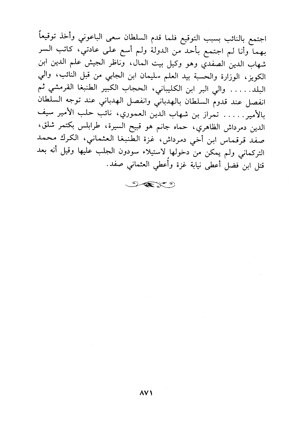 اجتمع بالنائب بسبب التوقيع فلما قدم السلطان سعى الباعوني وأخذ توقيعاً بهما وأنا لم اجتمع بأحد من الدولة ولم أسع على عادتي، كاتب السر شهاب الدين الصفدي وهو وكيل بيت المال، وناظر الجيش علم الدين ابن الكويز، الوزارة والحسبة بيد العلم سليمان ابن الجابي من قبل النائب، والي البلد ..... والي البر ابن الكليباني، الحجاب الكبير الطنبغا القرمشي ثم انفصل عند قدوم السلطان بالهدباني وانفصل الهدباني عند توجه السلطان بالأمير ..... تمراز بن شهاب الدين العموري، نائب حلب الأمير سيف الدين دمرداش الظاهري، حماه جانم هو قبيح السيرة، طرابلس بكتمر شلق، صفد قرقماس ابن أخي دمرداش، غزة الطنبغا العثماني، الكرك محمد التركماني ولم يمكن من دخولها لاستيلاء سودون الجلب عليها وقيل أنه بعد قتل ابن فضل أعطى نيابة غزة وأُعطي العثماني صفد.