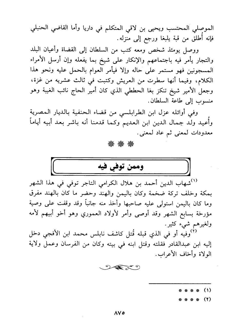 الموصلي المحتسب ويحيى بن لاقي المتكلم في داريا وأما القاضي الحنبلي فإنه أُطلق من قبة يلبغا ورجع إلى منزله.