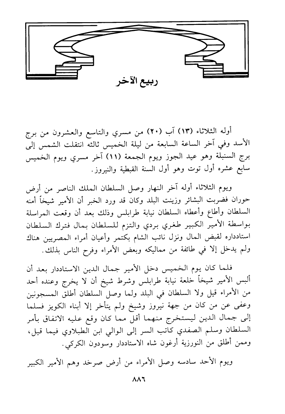 أوله الثلاثاء (13) آب (20) من مسري والتاسع والعشرون من برج الأسد وفي آخر الساعة السابعة من ليلة الخميس ثالثه انتقلت الشمس إلى برج السنبلة وهو عيد الجوز ويوم الجمعة (11) آخر مسري ويوم الخميس سابع عشره أول توت وهو أول السنة القبطية والنيروز.
