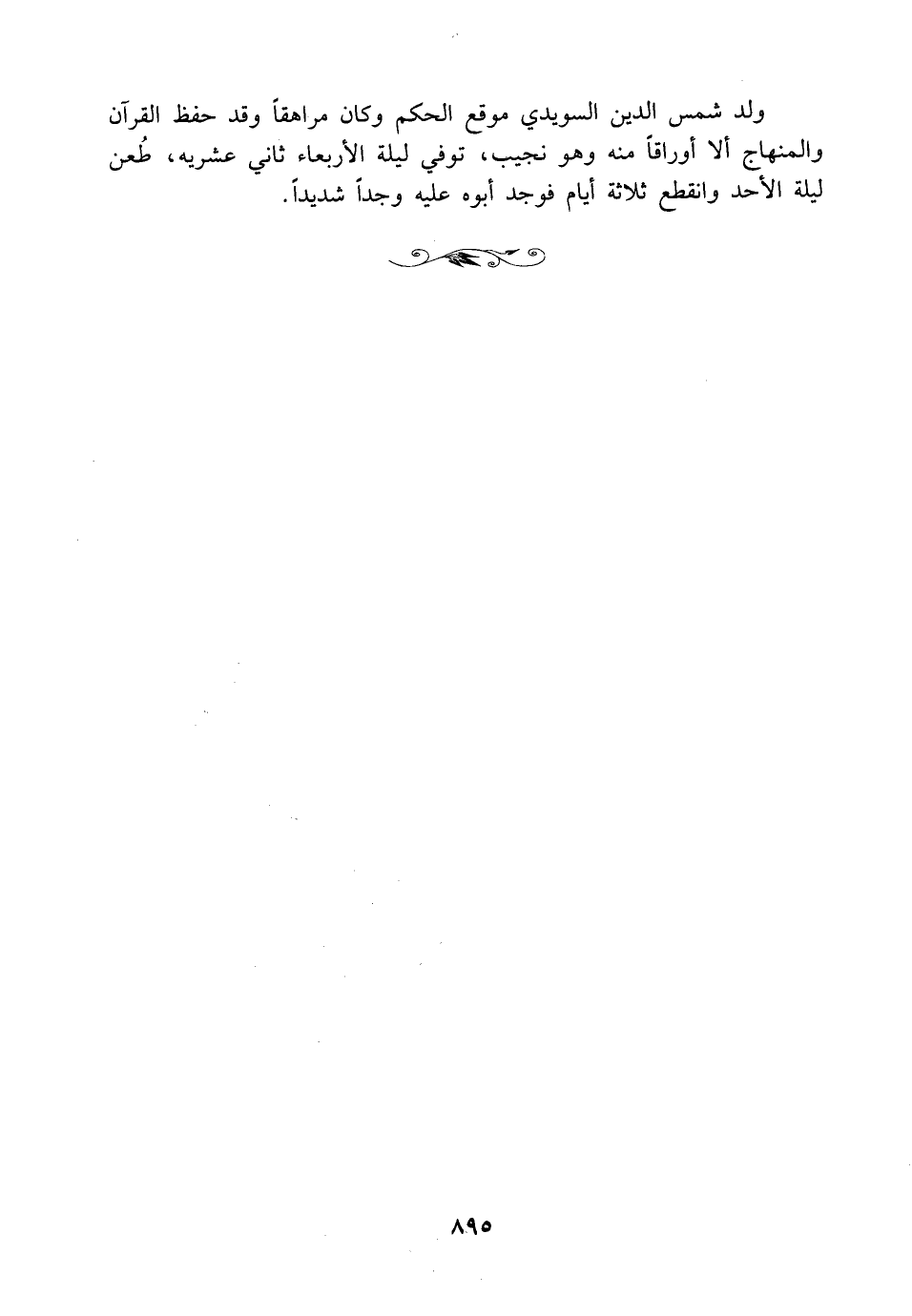 ولد شمس الدين السويدي موقع الحكم وكان مراهقاً وقد حفظ القرآن والمنهاج ألا أوراقاً منه وهو نجيب، توفي ليلة الأربعاء ثاني عشريه، طُعن ليلة الأحد وانقطع ثلاثة أيام فوجد أبوه عليه وجداً شديداً.