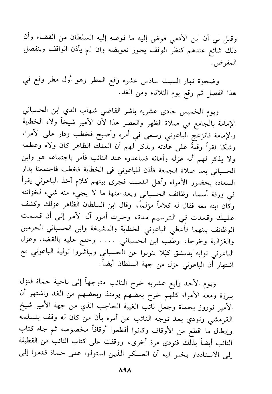 ويوم الخميس حادي عشريه باشر القاضي شهاب الدي ابن الحسباني الإمامة بالجامع في صلاة الظهر والعصر هذا لأن الأمير شيخاً ولاه الخطابة والإمامة فانزعج الباعوني وسعى في أمره وأصبح فخطب ودار على الأمراء وشكا فقراً وقلةً على عادته ويذكر لهم أن الملك الظاهر كان ولاه وعظمه ولا يذكر لهم أنه عزله وأهانه فساعدوه عند النائب فأمر باجتماعه هو وابن الحسباني بعد صلاة الجمعة فأذن للباعوني في الخطابة فخطب فاجتمعنا بدار السعادة بحضور الأمراء وأهل الدست فجرى بينهم كلام أخذ الباعوني يقرأ في ورقة أسماء وظائف الحسباني ويعد منها ما لا يجيء منه شيء لخزانته وكان ابنه معه فقال له كلاماً مؤلماً، وقال ابن السلطان الظاهر عزلك وكشف عليك وقعدت في الترسيم مدة، وجرت أمور آل الأمر إلى أن قسمت الوظائف بينهما فأُعطي الباعوني الخطابة والمشيخة وابن الحسباني الحرمين والغزالية وخرجا، وطلب ابن الحسباني ..... وخلع عليه بالقضاء وعزل الباعوني نوابه بدمشق كيلا ينوبوا عن الحسباني ويباشروا تولية الباعوني مع اشتهار أن الباعوني عزل من جهة السلطان أيضاً.