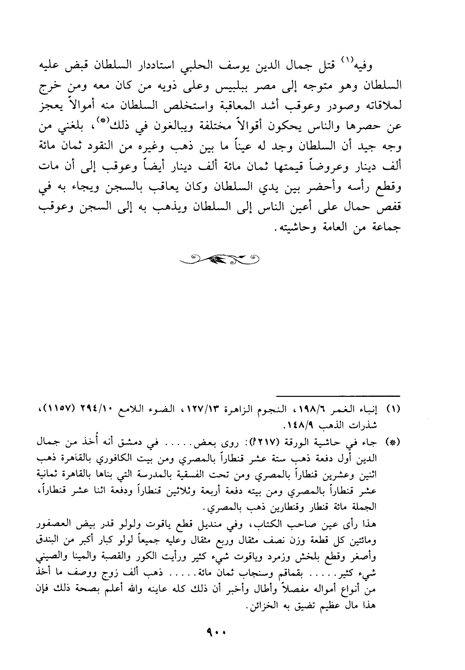 (*) جاء في حاشية الورقة (217 أ): روى بعض ..... في دمشق أنه أُخذ من جمال الدين أول دفعة ذهب ستة عشر قنطاراً بالمصري ومن بيت الكافوري بالقاهرة ذهب اثنين وعشرين قنطاراً بالمصري ومن تحت الفسقية بالمدرسة التي بناها بالقاهرة ثمانية عشر قنطاراً بالمصري ومن يته دفعة أربعة وثلاثين قنطاراً ودفعة اثنا عشر قنطاراً، الجملة مائة قنطار وقنطارين ذهب بالمصري.