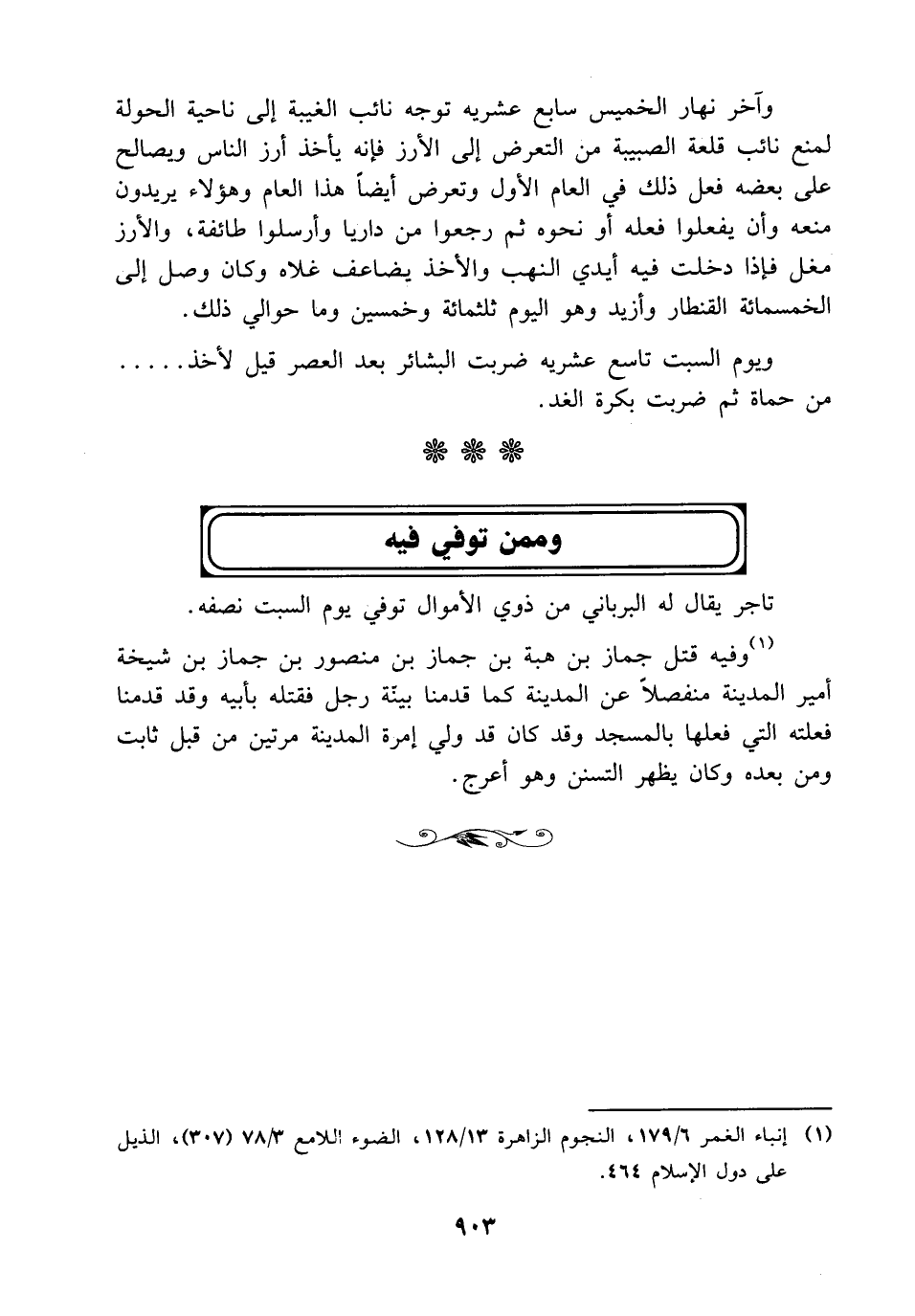 (¬1) وفيه قتل جماز بن هبة بن جماز بن منصور بن جماز بن شيخة أمير المدينة منفصلاً عن المدينة كما قدمنا بينّة رجل فقتله بأبيه وقد قدمنا فعلته التي فعلها بالمسجد وقد كان قد ولي إمرة المدينة مرتين من قبل ثابت ومن بعده وكان يظهر التسنن وهو أعرج.