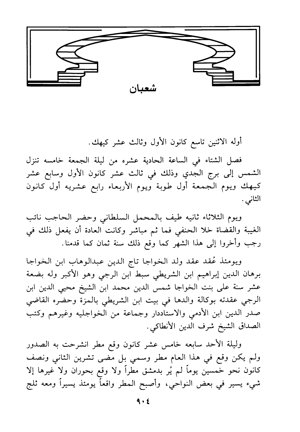 وليلة الأحد سابعه خامس عشر كانون وقع مطر انشرحت به الصدور ولم يكن وقع في هذا العام مطر وسمي بل مضى تشرين الثاني ونصف كانون نحو خمسين يوماً لم يُر بدمشق مطراً ولا وقع بحوران ولا غيرها إلا شيء يسير في بعض النواحي، وأصبح المطر واقعاً يومئذ يسيراً ومعه ثلج