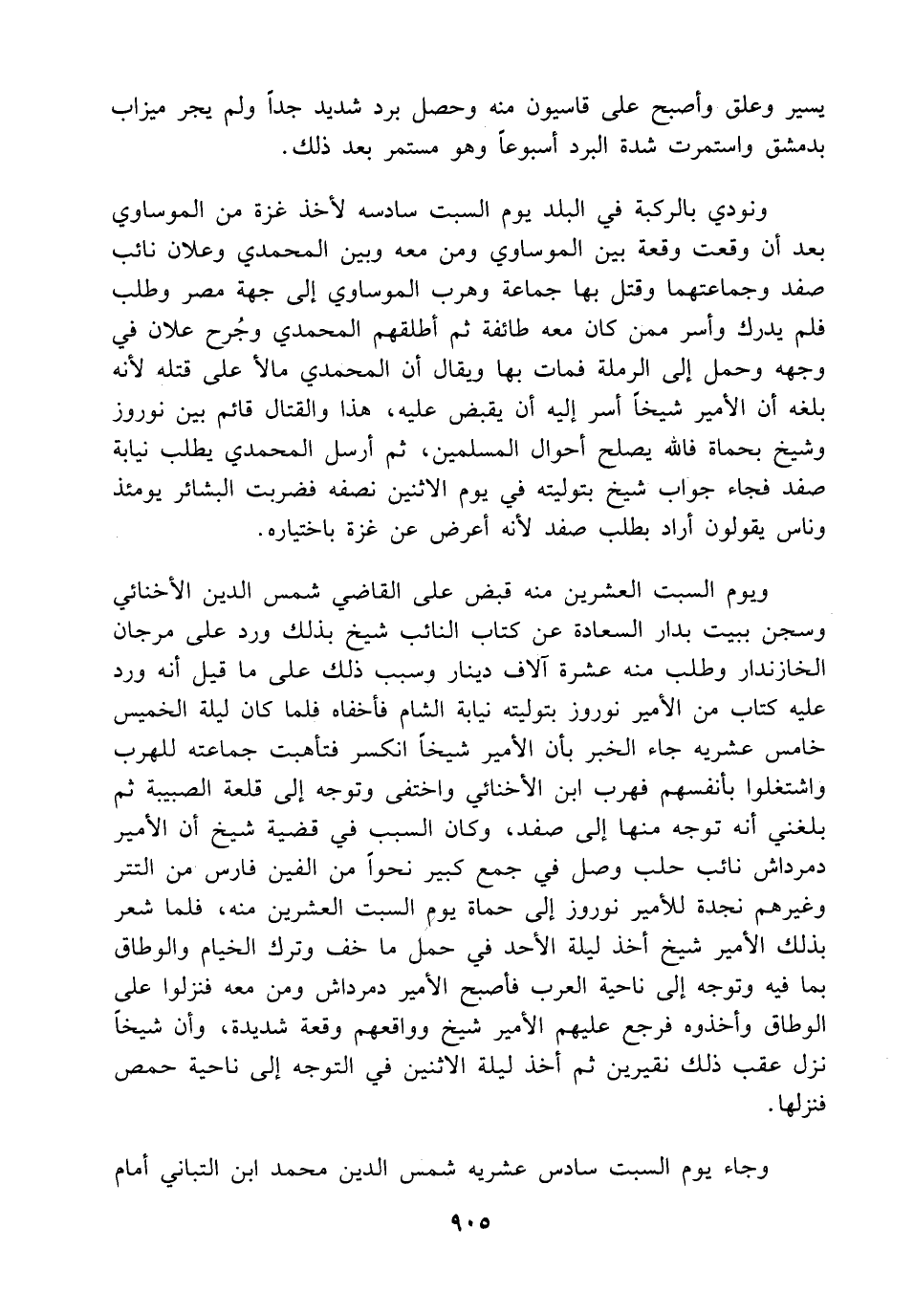 ونودي بالركبة في البلد يوم السبت سادسه لأخذ غزة من الموساوي بعد أن وقعت وقعة بين الموساوي ومن معه وبين المحمدي وعلان نائب صفد وجماعتهما وقتل بها جماعة وهرب الموساوي إلى جهة مصر وطلب فلم يدرك وأسر ممن كان معه طائفة ثم أطلقهم المحمدي وجُرح علان في وجهه وحمل إلى الرملة فمات بها ويقال أن المحمدي مالاً على قتله لأنه بلغه أن الأمير شيخاً أسر إليه أن يقبض عليه، هذا والقتال قائم بين نوروز وشيخ بحماة فالله يصلح أحوال المسلمين، ثم أرسل المحمدي يطلب نيابة صفد فجاء جواب شيخ بتوليته في يوم الاثنين نصفه فضربت البشائر يومئذ وناس يقولون أراد بطلب صفد لأنه أعرض عن غزة باختياره.