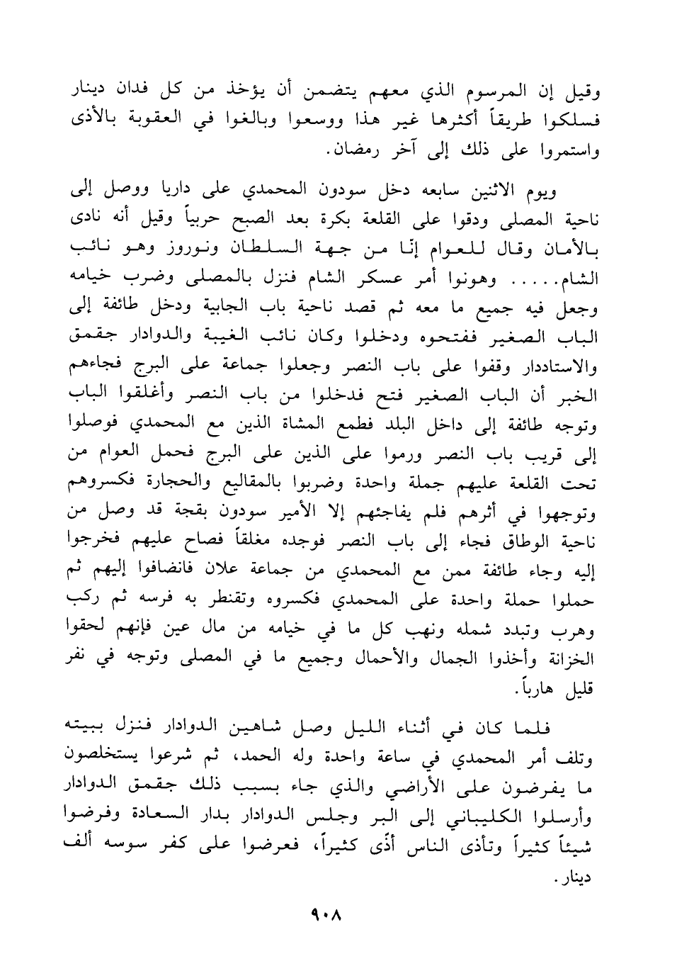 وقيل إن المرسوم الذي معهم يتضمن أن يؤخذ من كل فدان دينار فسلكوا طريقاً أكثرها غير هذا ووسعوا وبالغوا في العقوبة بالأذى واستمروا على ذلك إلى آخر رمضان.
