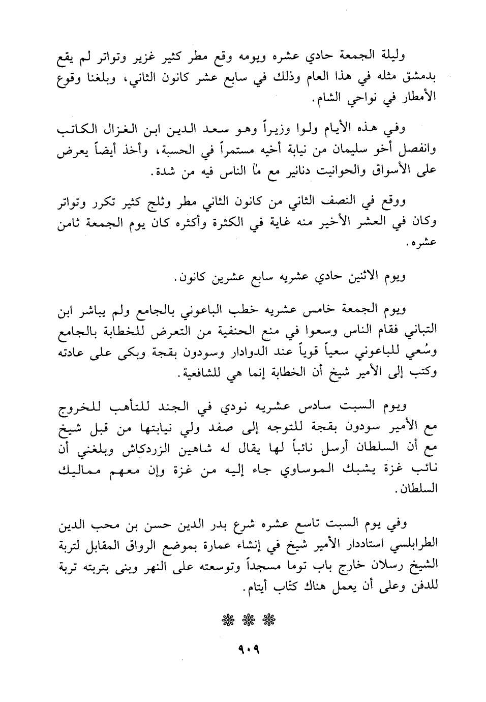 وليلة الجمعة حادي عشره ويومه وقع مطر كثير غزير وتواتر لم يقع بدمشق مثله في هذا العام وذلك في سابع عشر كانون الثاني، وبلغنا وقوع الأمطار في نواحي الشام.